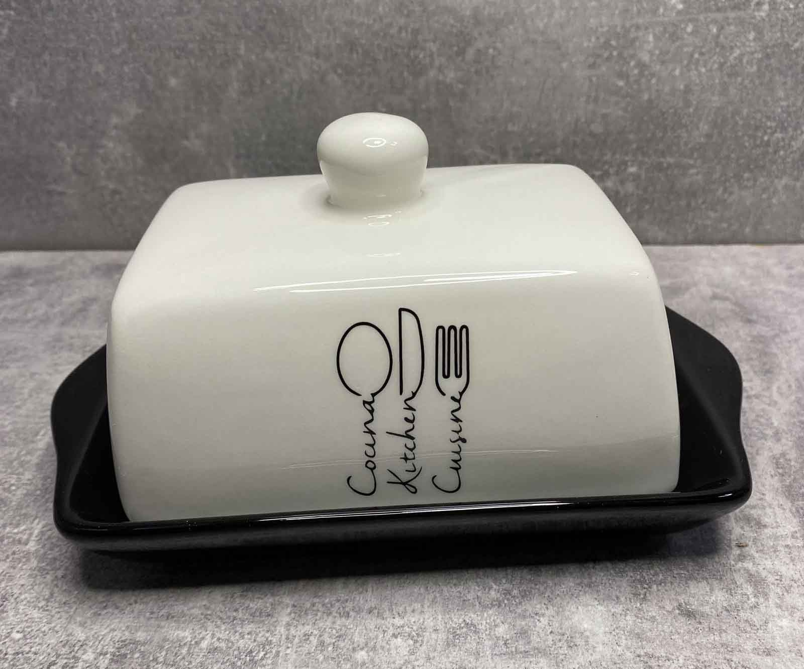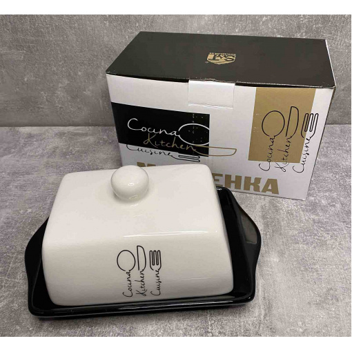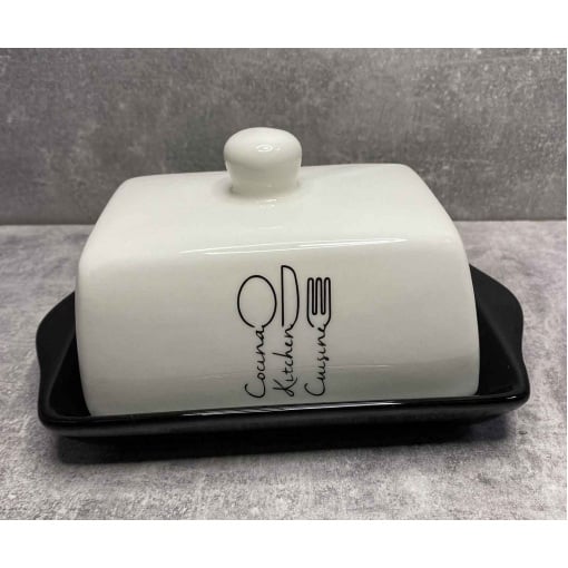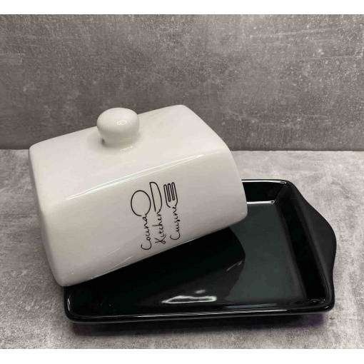 Маслянка 20*13*10,4 см S&T Bon appetit 700-02-17 Характеристика: Вид: Маслянка Матеріал: Кераміка Розмір: 20*13*10,4 см Колір: Чорно-білий Форма: Прямокутна Декорування: З принтом