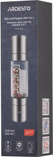 Детальні характеристики Млин для солі та перцю 2в1 акрил/нержавіюча сталь Ardesto Gemini AR2102SS.