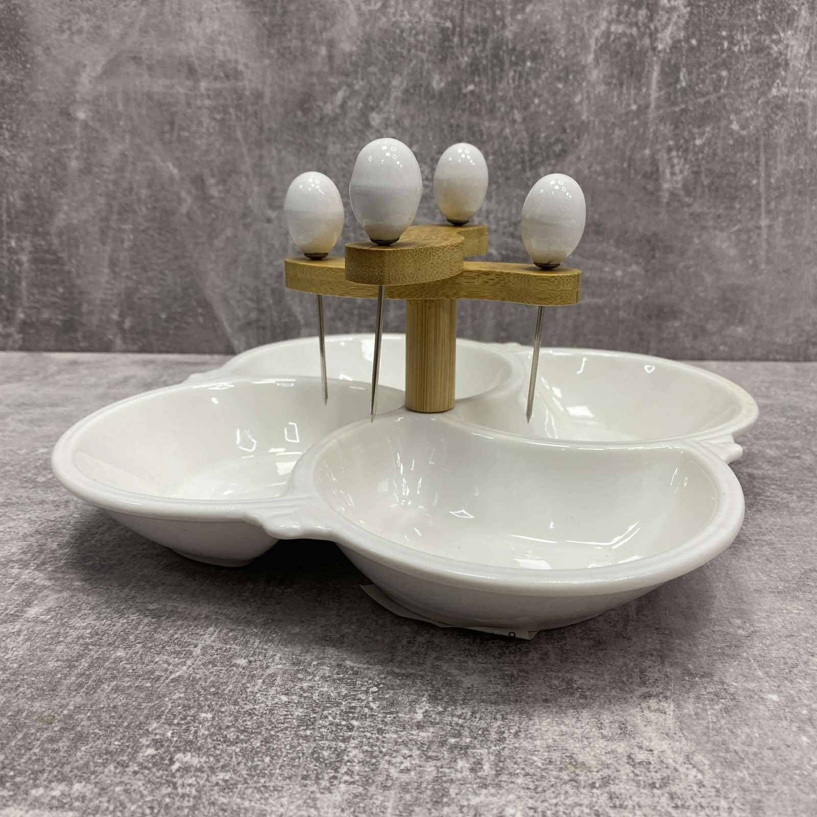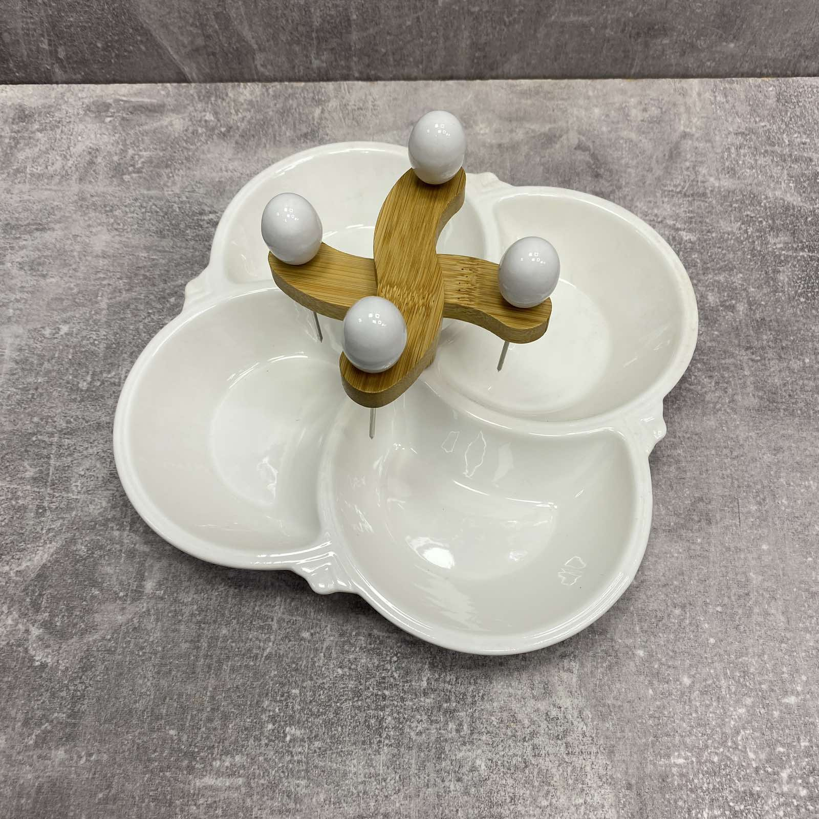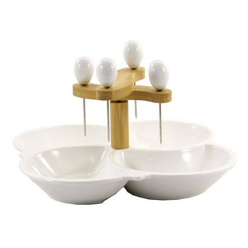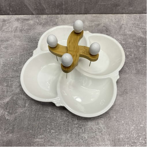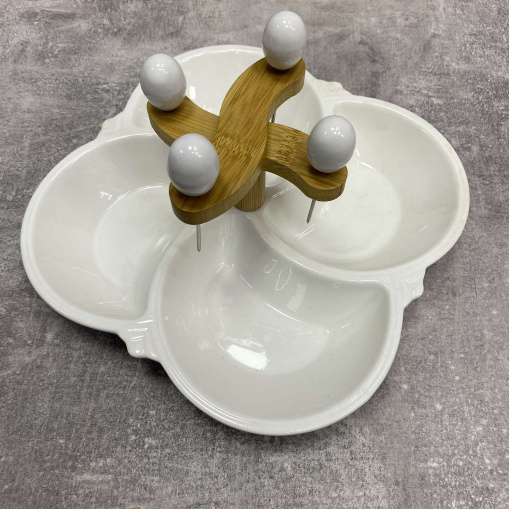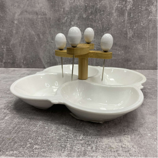 Детальні характеристики Мінажниця 4-х секційна порцелянова 21 см з 4 шпажками Interos PJ02538-S.