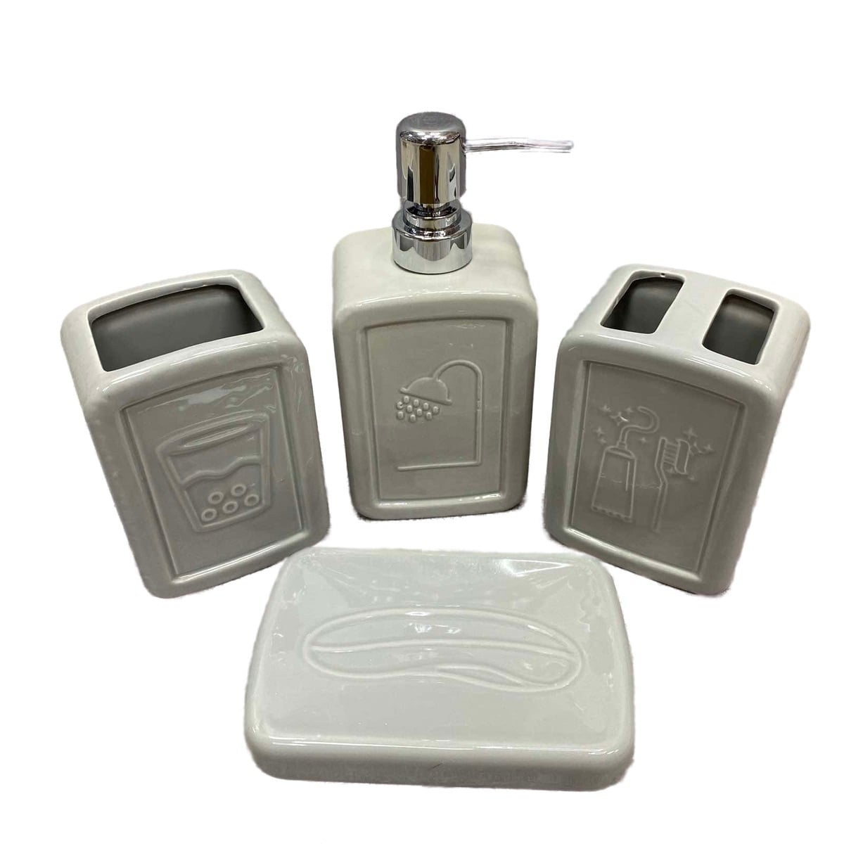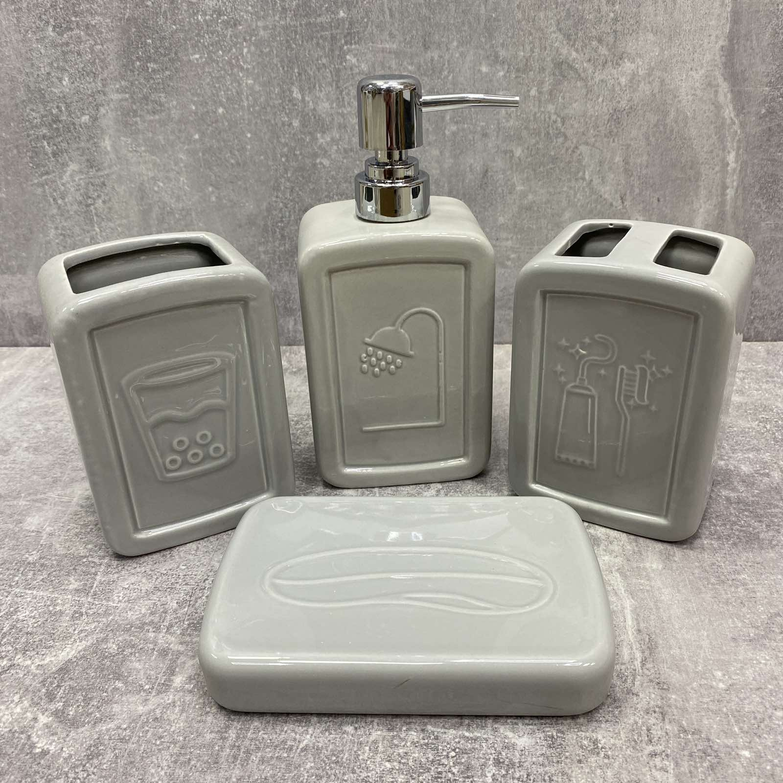 Набір для ванної кімнати – це функціональний набір аксесуарів для ванної кімнати із сучасним, стильним дизайном. Набір складається з 4 предметів: дозатора для рідкого мила, мильниці для жорсткого мила, підставки для зубних щіток та склянки. Вироби гармонійно впишуться в інтер'єр ванної кімнати і прикрасять її.