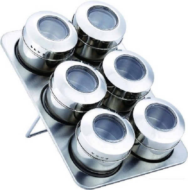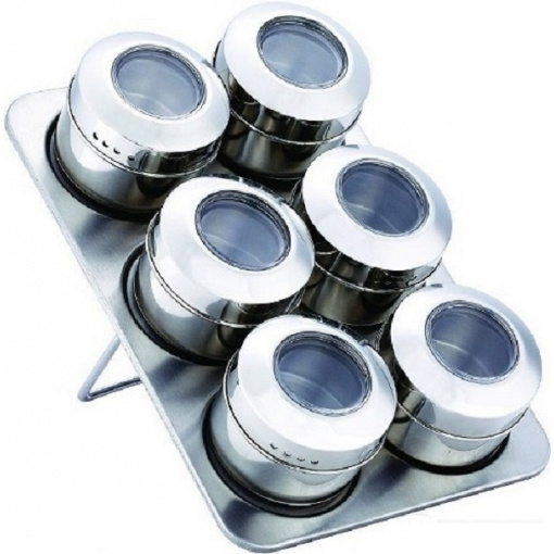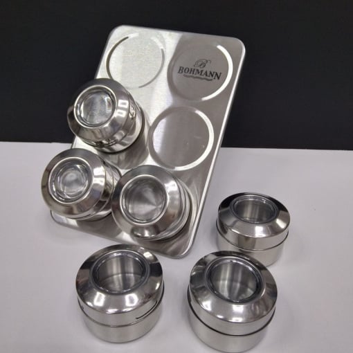Набір для спецій ідеально підходить для зберігання сушених трав та спецій. У набір входять 6 баночок з нержавіючої сталі з невеликими віконцями для визначення вмісту баночок і магнітна підставка. Помістивши в кожну ємність різні за кольором приправи - каррі, сіль, перець та ін. - можна прикрасити кухню або їдальню, додавши потрібний колорит. Кришки ємностей забезпечені різьбленням, яке забезпечує щільне прилягання, а це у свою чергу дозволить зберегти спеції свіжими тривалий час. Bohmann - відомий виробник кухонної посудини з Австрії. Вироби під маркою Bohmann (Бохманн) користується заслуженим попитом, оскільки багато українських господарок змогли гідно оцінити якість і дизайн цієї посуду.