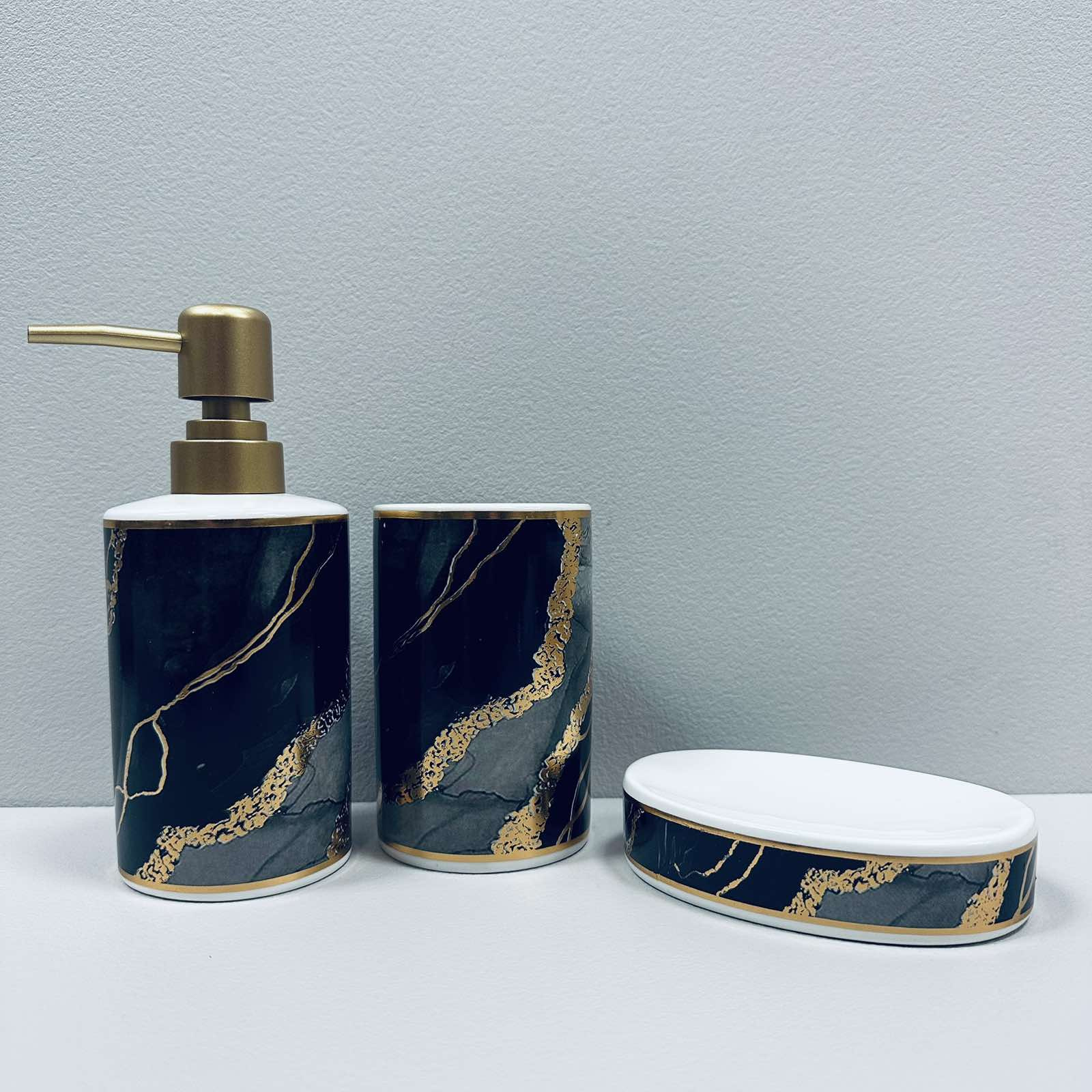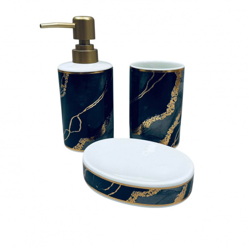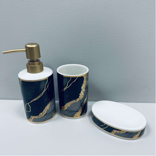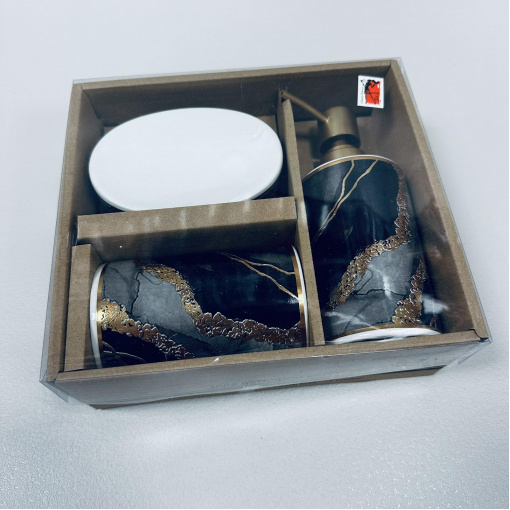 Стильний та функціональний набір аксесуарів для ванної та кухні. Характеристика: Вид: Набір для ванної Матеріал: Кераміка Колір: Чорний мармур із золотом. Розмір: Дозатор: 7*17,3 см Стакан: 7,2*11,1 см Мильниця: 12*8,4*2,5 см Комплектація: Дозатор, склянка, мильниця