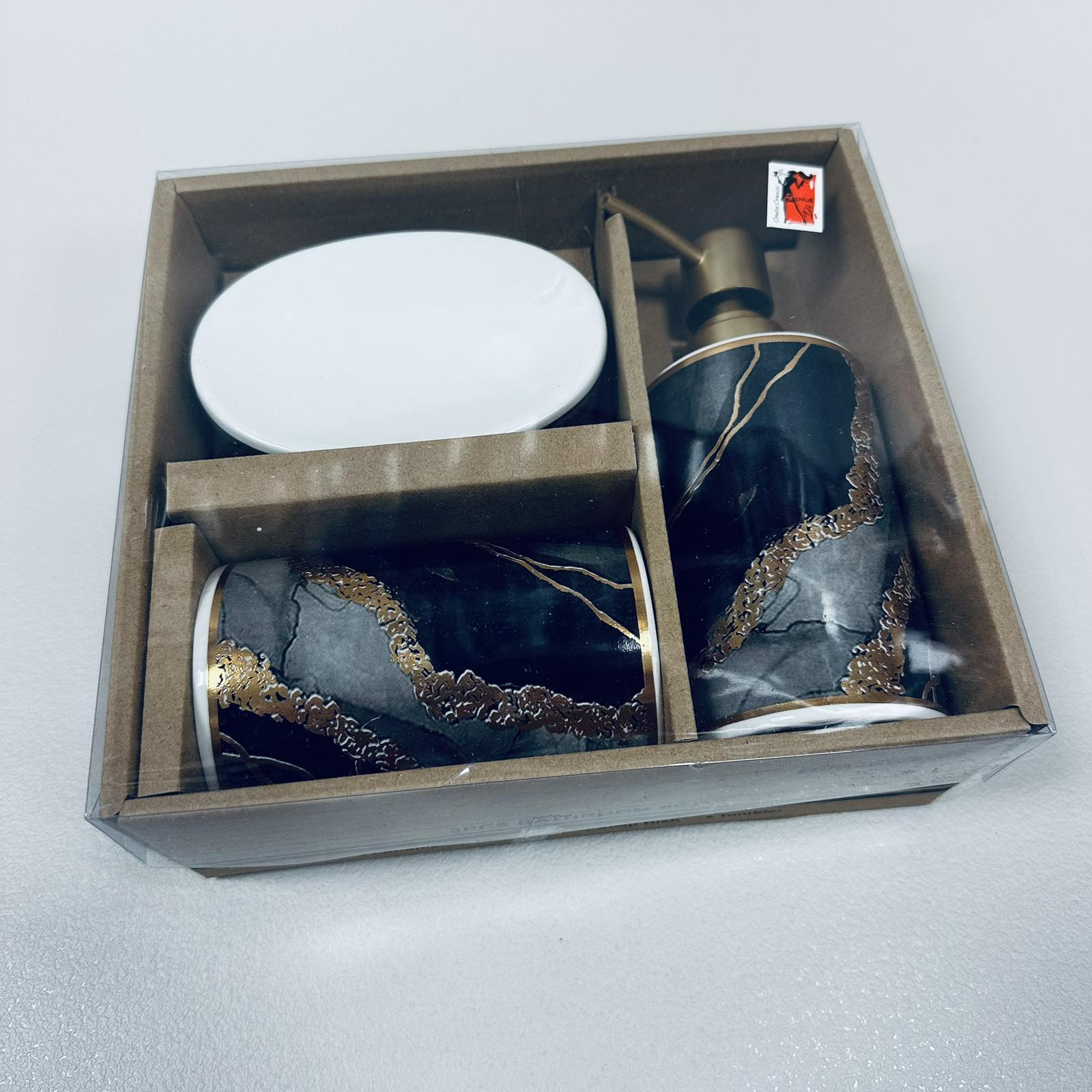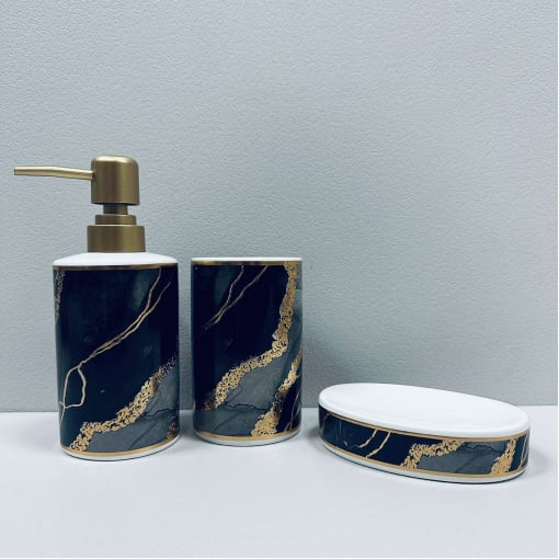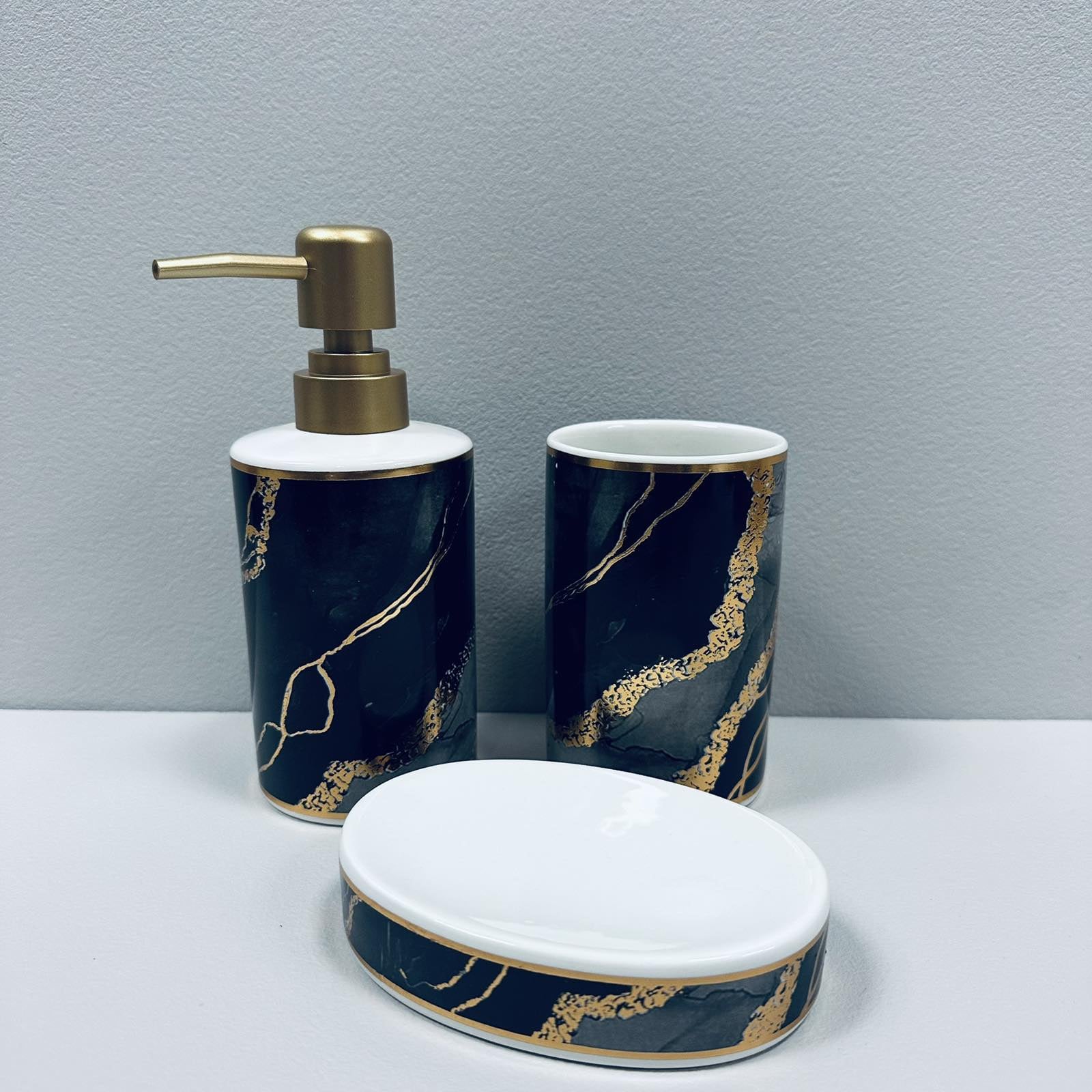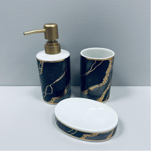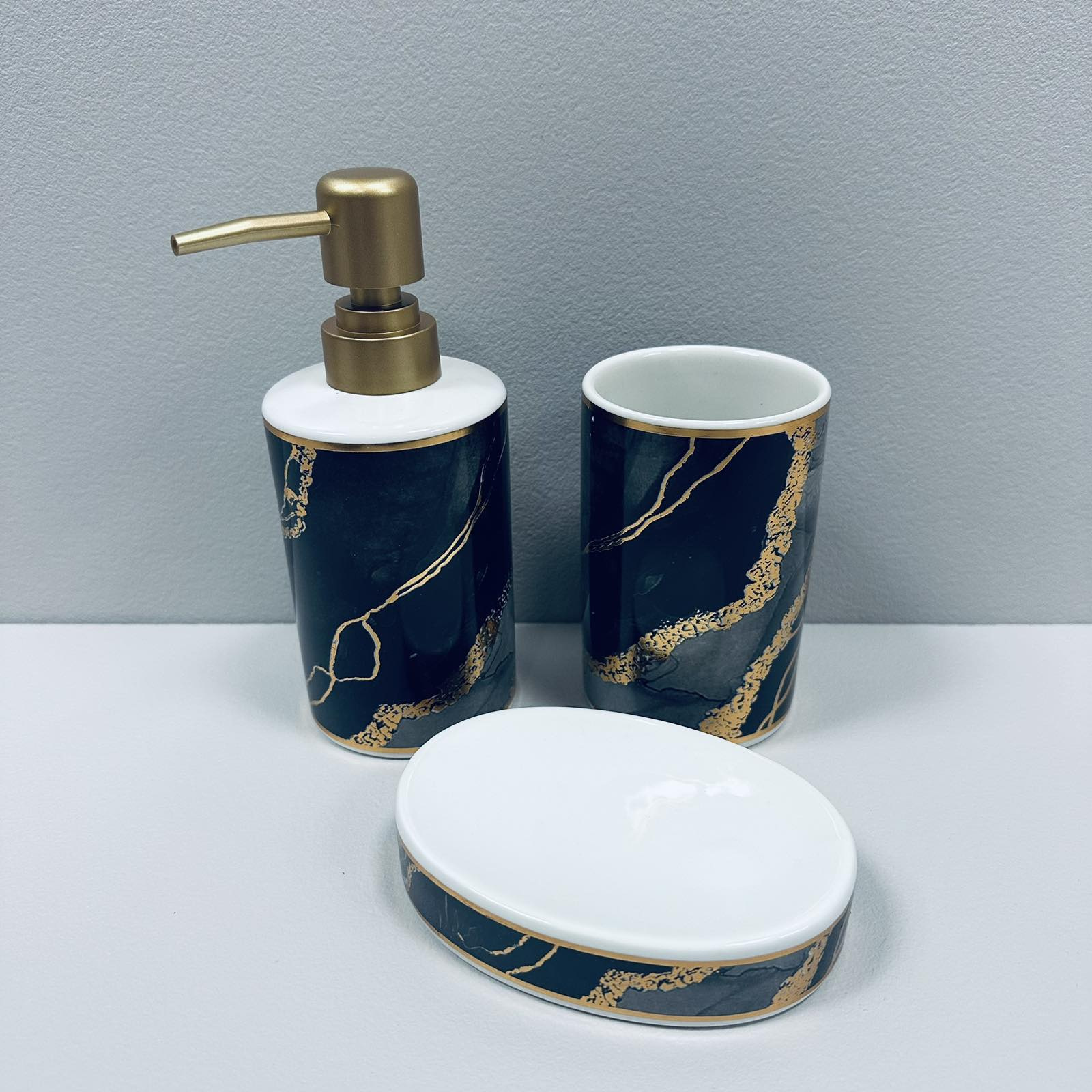 Набір для ванної (3 предмети) дозатор для мила, склянка для зубних щіток та мильниця Чорний мармур із золотом Bona Di 853-174