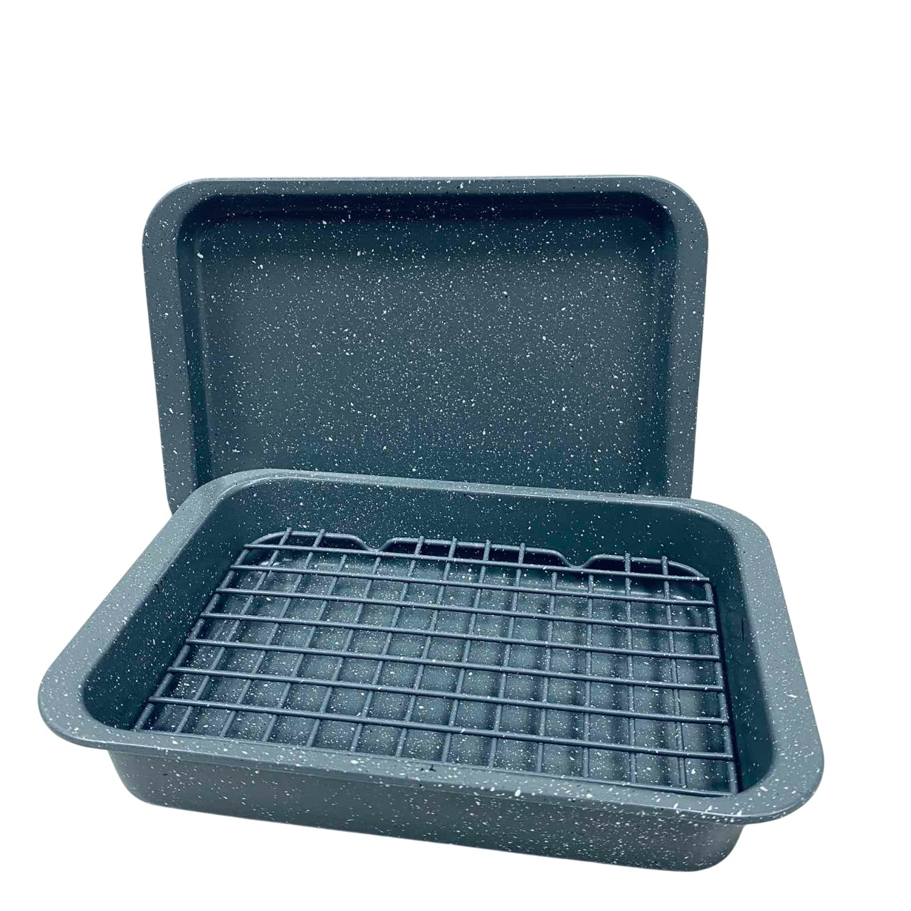 Набір форм для випікання міні зі сталі 25,5*17,8*5 см A-Plus 1283 Характеристика: Вид: Форма Тип постачання: Набір Матеріал: Сталь Форма: Прямокутна Розмір: Деко більше - 25,5*17,8*4,5 см, деко менше - 25,5*17,8*1,7 см, решітка - 21*14,9*1,2 см