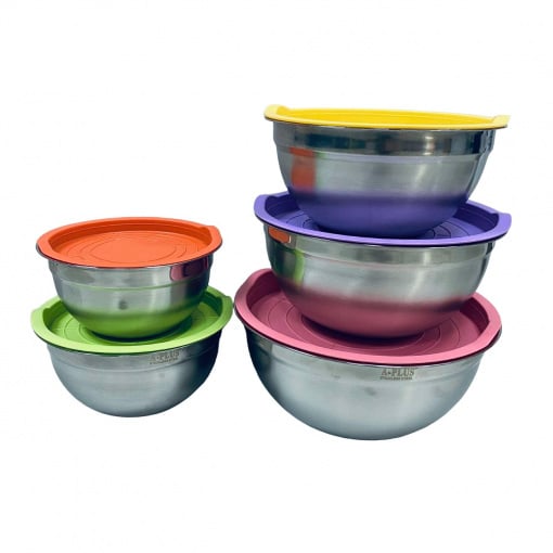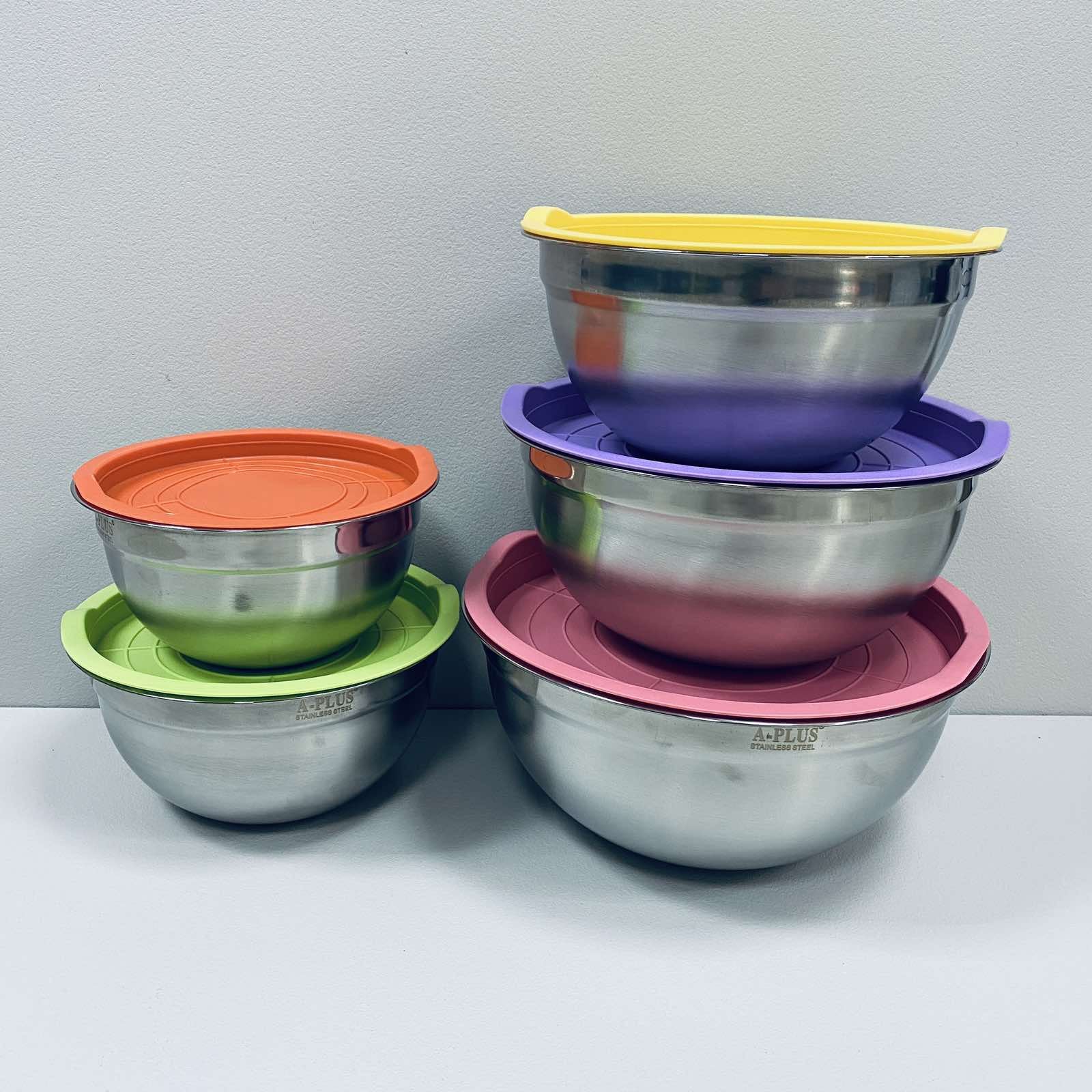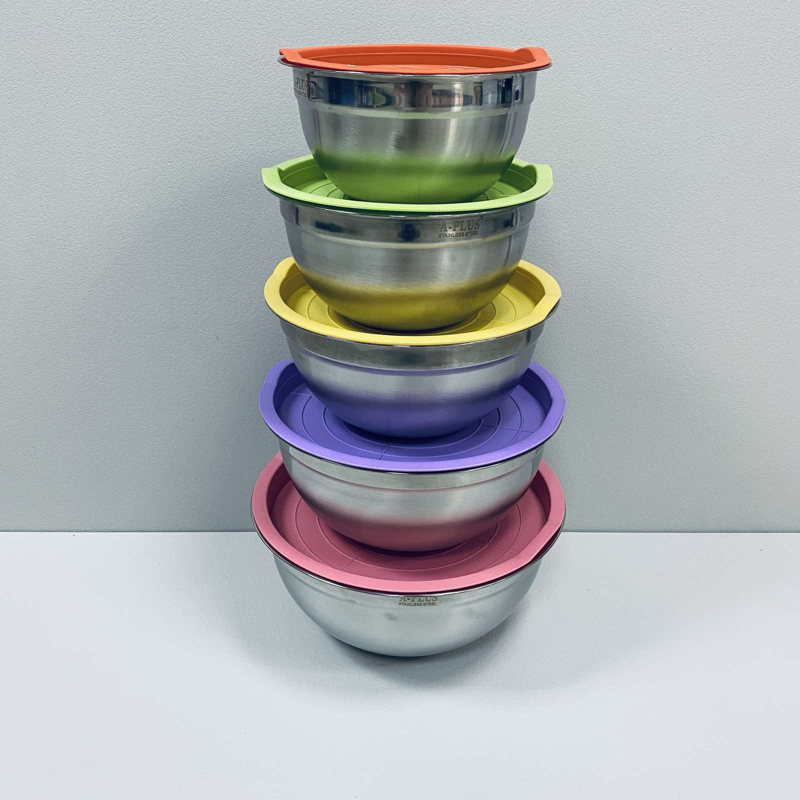 Набір мисок 5 шт із нержавіючої сталі з пластиковими кришками А-PLUS 9035 Високоякісні миски з нержавіючої сталі та пластикові кришки для максимального зберігання продуктів, випікання та приготування їжі. Широкий плоский обід забезпечує міцне зчеплення. Миски відмінно підходять для змішування, збивання, приготування їжі та сервірування! Набагато глибше, ніж стандартні набори мисок, виготовлені з нержавіючої сталі.Кришки виготовлені із гнучкого HDPE пластику. Кожна кришка поміщається врівень усередині їх чашки для сервіровки для більш щільного прилягання і має втоплений верх. Легко знімайте та заміняйте кришки зручними ручками. Такі кухонні ємності для холодильника та морозильника прості в ручному чищенні та безпечні! Характеристика: Тип: набір мисок Кількість у наборі: 5 шт Матеріал: нержавіюча сталь Форма: кругла Діаметр:18 см, 20 см, 22 см, 24 см, 26 см Об'єм: 1,2 л, 1,5 л, 2 л, 2,5 л, 3 л