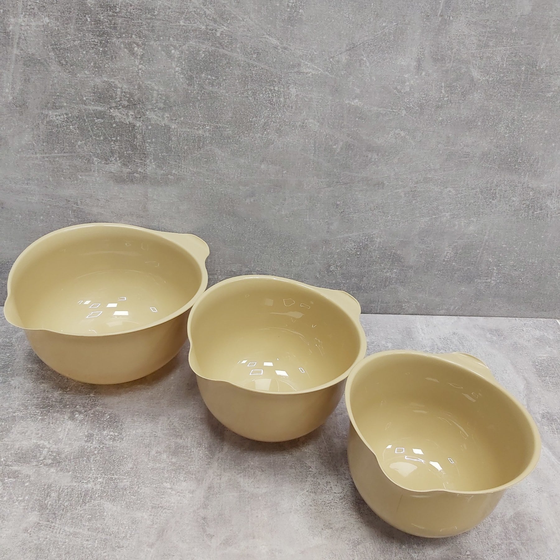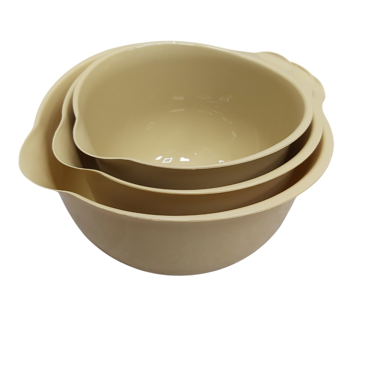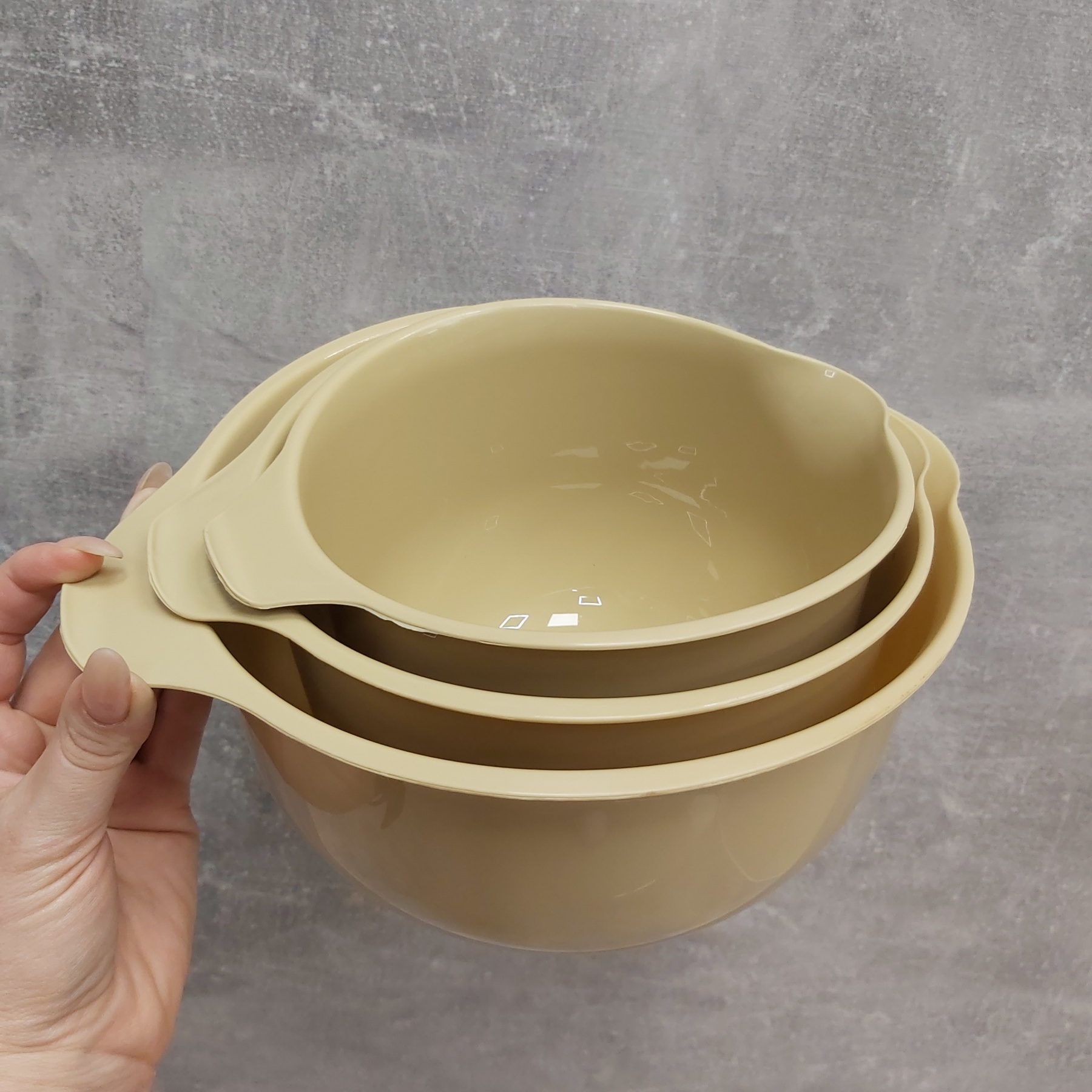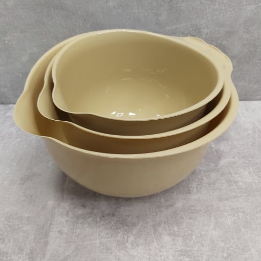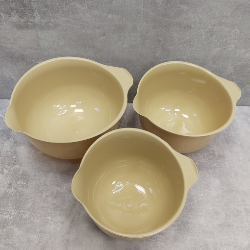 Набір мисок для міксера 3 шт 26 см, 22,5 см, 20 см Lamela Грація 2493 Три кухонні миски різного розміру стануть у нагоді для замісу тіста, збивання крему та приготування різноманітних страв. Їх розмір та конструкція розроблені так, щоб вони легко входили один від одного та займали мало місця у вашій кухні. Характеристика: Вид: Миски Тип постачання: Набір Матеріал: Пластик Кількість в наборі: 3 шт Розмір: 26 см, 22,5 см, 20 см Колір: Бежевий