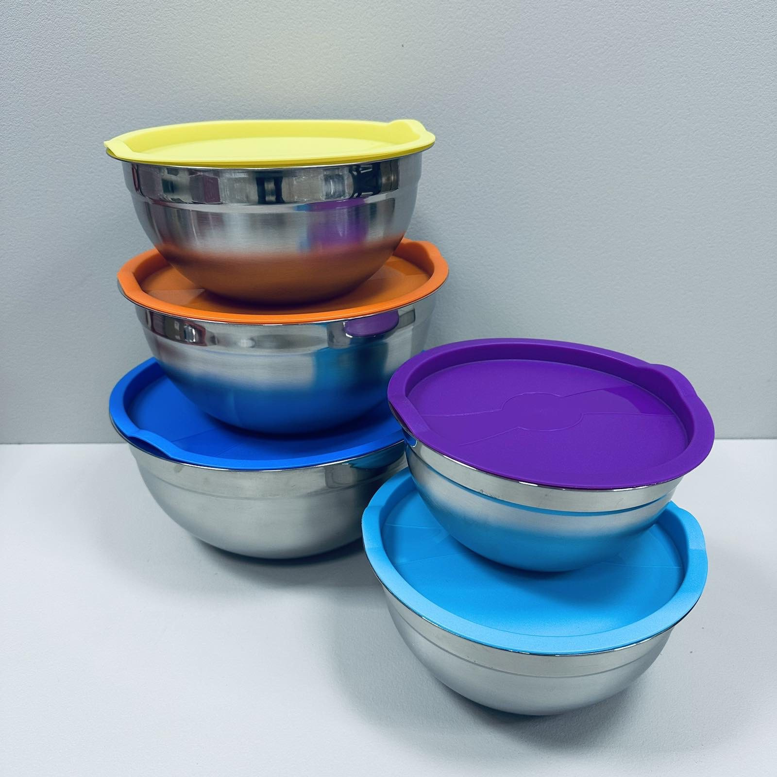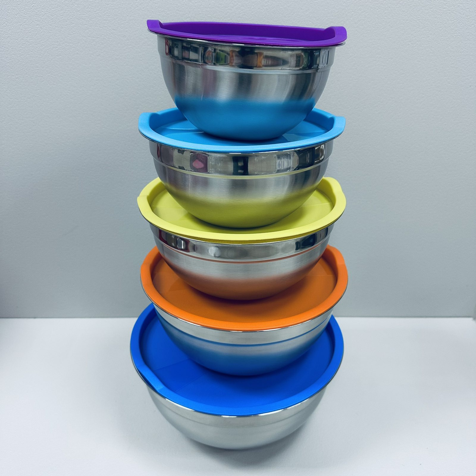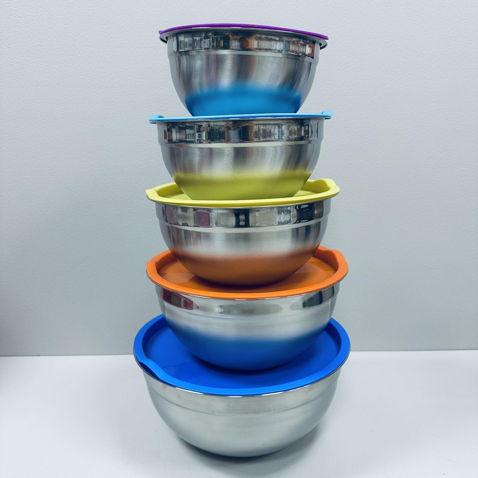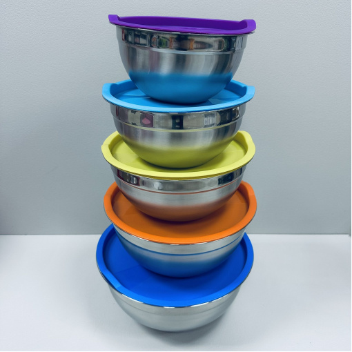 Набір мисок із нержавіючої сталі із пластиковими кришками Stenson R93600 18/20/22/24/26 см 5 шт Різнокольоровий (23460)