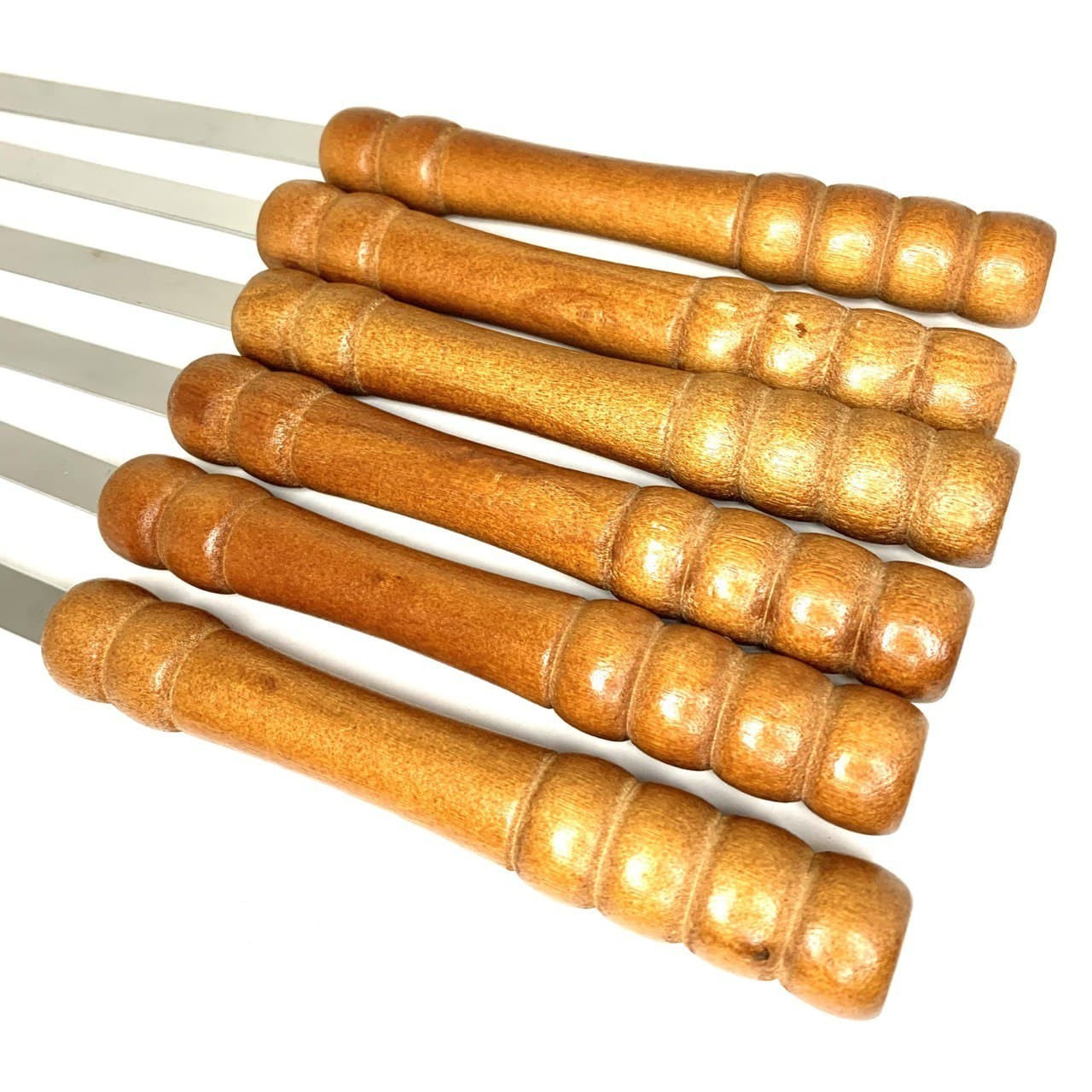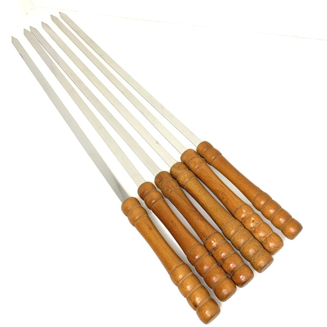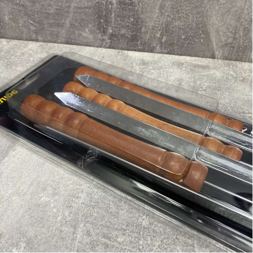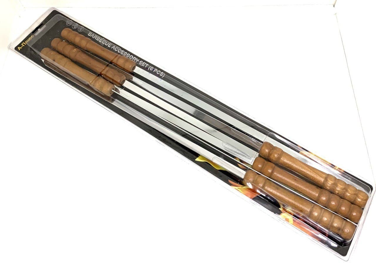 Набір шампурів для гриля виготовлений із харчової нержавіючої сталі високої якості шириною 10 мм та товщиною 2 мм із дерев'яною ручкою. Цей метал не вступає в реакцію з їжею під час експлуатації, а значить не змінює її смак та запах. Товар є міцним та довговічним, має зручну ручку завдяки якій можна фіксувати шампур у потрібному положенні. За допомогою таких багатофункціональних шампурів можна приготувати різноманітні страви (м'ясо, овочі). Приготування на вугіллі або відкритому вогні заощаджує Ваш час. Також їх легко очистити після експлуатації навіть у прохолодній воді. Стануть незамінним помічником для дому, на дачі чи рибалці. Прекрасно підходить для обладнання громадського харчування.