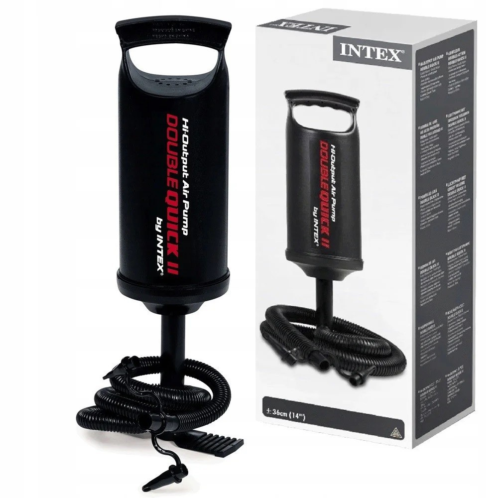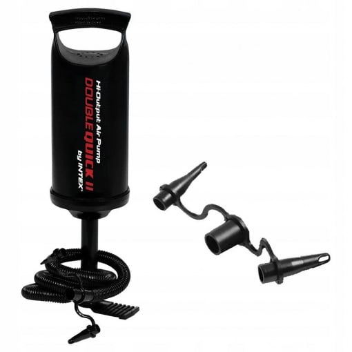 Ручний насос відмінно підійде для накачування надувних виробів Intex. Він має три насадки, що є перехідниками для різних моделей надувних ліжок, подушок, крісел, матраців Intex. Насос виготовлений із міцного пластику з гофрованим шлангом. Закачування здійснюється шляхом прямого та зворотного руху поршня.