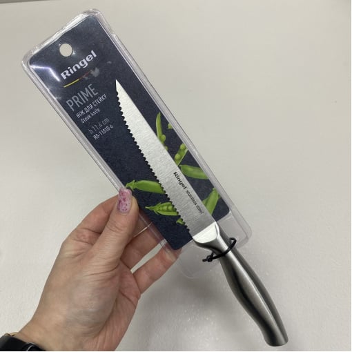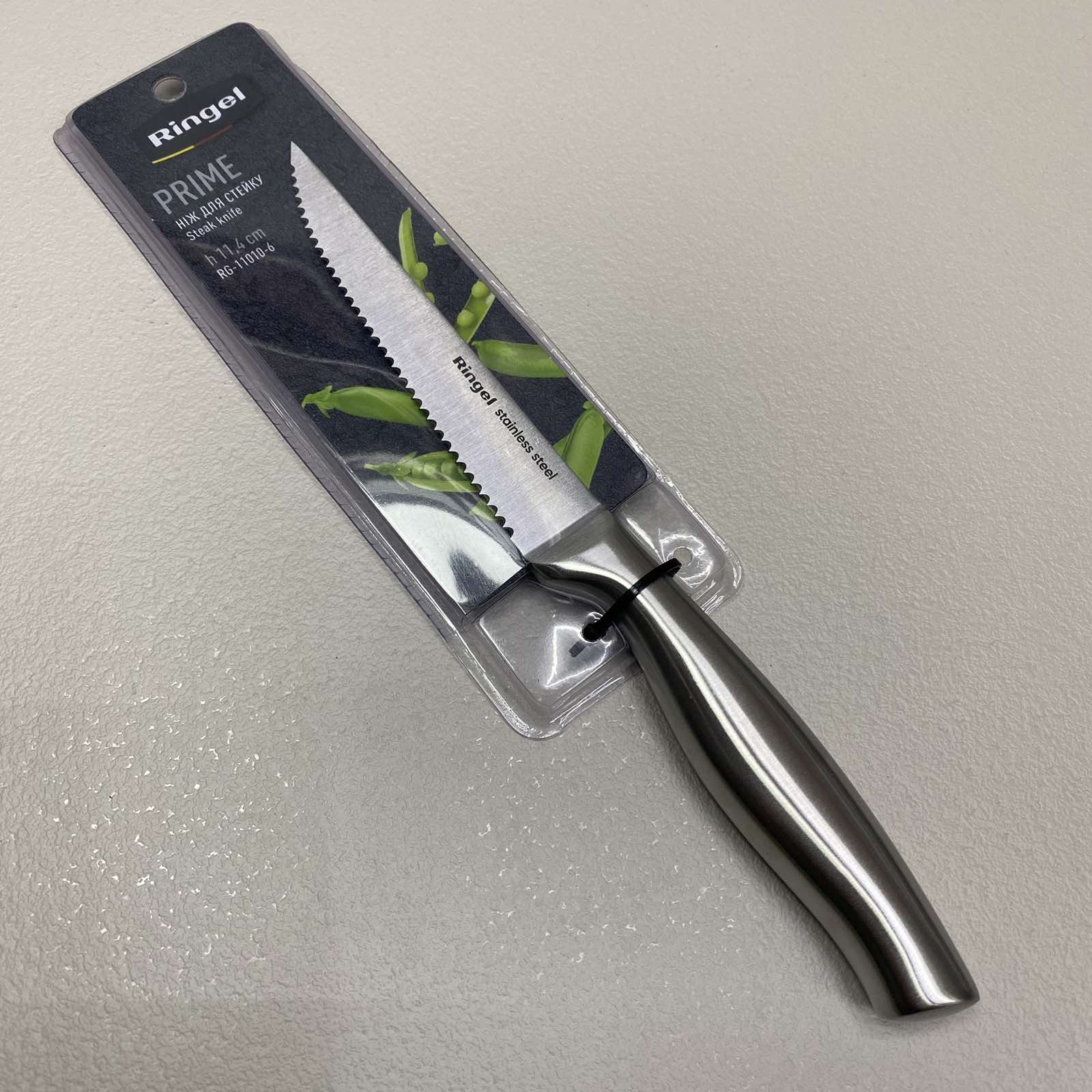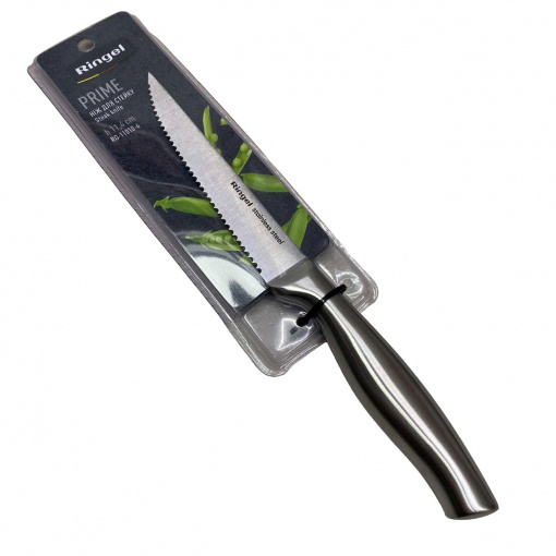 Ніж для стейку з нержавіючої сталі 11,4 см. Ringel Prime RG-11010-6 Лезо з нержавіючої сталі, що має високу міцність і корозостійкість із сатиновою поліровкою. Характеристика: Вид: Ніж Призначення: Для стейку Матеріал леза: Нержавіюча сталь Матеріал ручки: Нержавіюча сталь Довжина леза: 11,4 см Колір: Сталевий