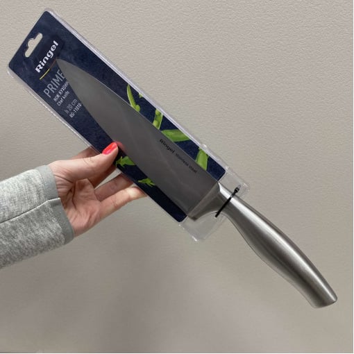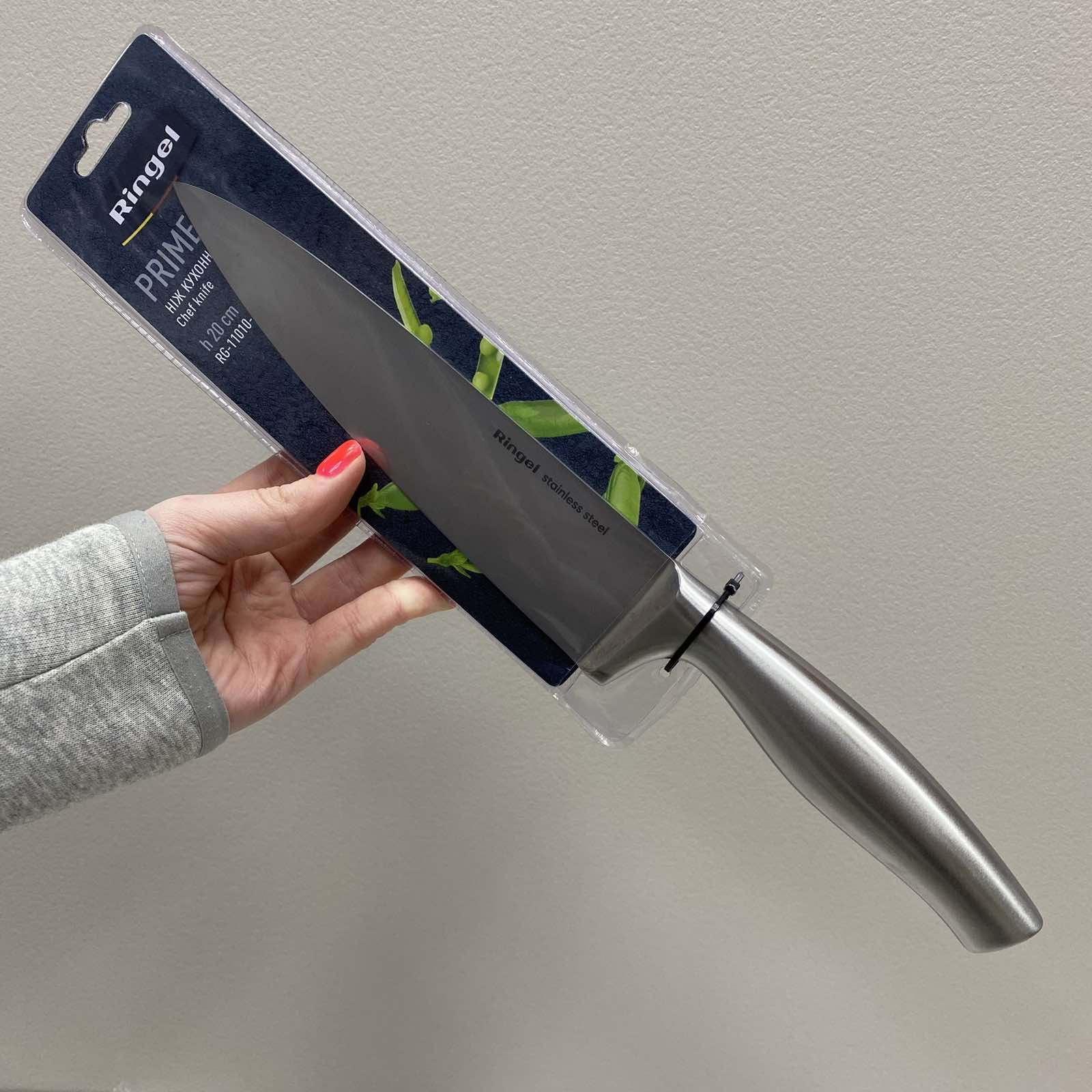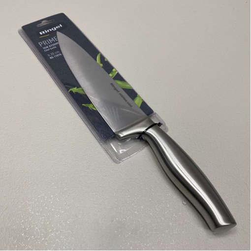 Ніж кухонний з нержавіючої сталі 20 см. Ringel Prime RG-11010-4 Лезо з нержавіючої сталі, що має високу міцність і корозостійкість із сатиновою поліровкою. Характеристика: Вид: Ніж Призначення: Кухонний Матеріал леза: Нержавіюча сталь Матеріал ручки: Нержавіюча сталь Довжина леза: 20 см Колір: Сталевий