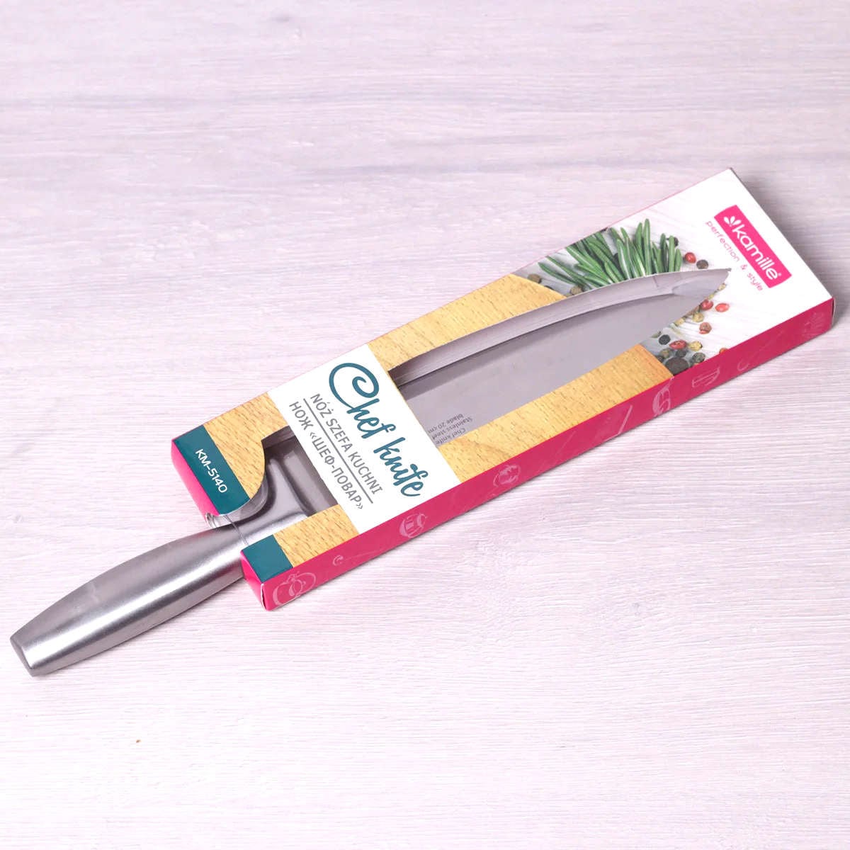 Ніж Шеф-кухар Kamille KM-5140 Кухонні ножі - те, без чого неможливо обійтися при приготуванні їжі. За тисячі років кулінарної історії людство винайде найрізноманітніші види ножів: універсальні, обробні, обвалочні або філейні. Хороші кухонні ножі за всіх часів цінувалися дуже високо. - Довжина рукоятки: 13 см