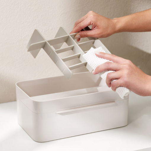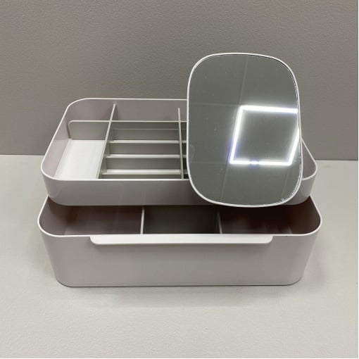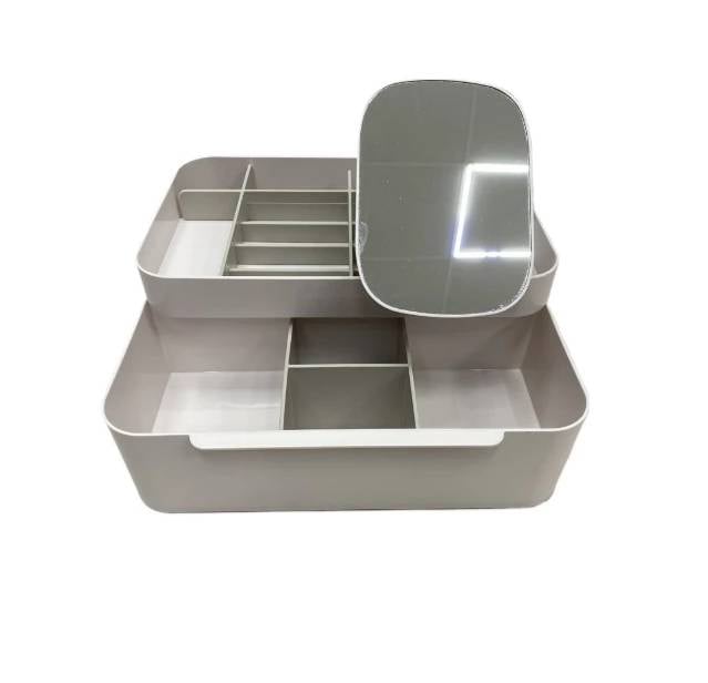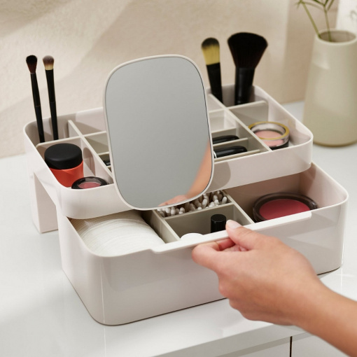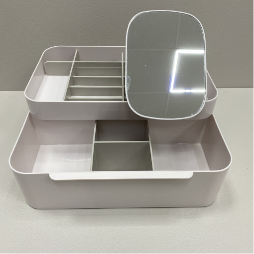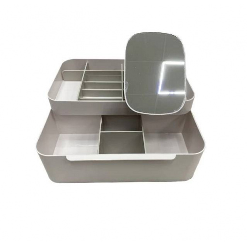 Органайзер для косметики з дзеркалом пластиковий 29,7*18,4*12,1 см A-Plus 75005 Цей стильний і практичний органайзер чудово підходить для зберігання вашої косметики, аксесуарів догляду за шкірою та інших дрібниць, забезпечуючи максимальну організацію та легкість доступу до всіх ваших засобів краси. Характеристика: Вид: Органайзер Матеріал: Пластик Призначення: Для косметики Довжина: 29,7 см Ширина: 18,4 см Висота: 12,1 см Колір: Бежевий Розмір: шухляда 29,7*13,8*8,6 см, дзеркало 11,4*16 см