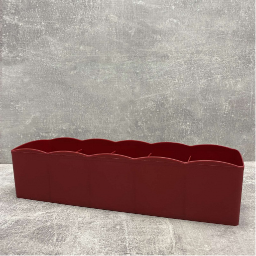 Органайзер для дрібниць прямокутний 27*9*6.5 см 5 секцій Elif Plastik E-393 червоний Виготовлений із гіпоалергенного матеріалу – поліпропілен. Висока міцність матеріалу до механічних та хімічних впливів. Використовується для зберігання різного приладдя для дому. Відмінно підійде для сучасного інтер'єру, дана продукція представлена ​​у різних варіаціях кольору. Настільний органайзер для дрібниць підходить для зберігання канцелярії, косметики, кухонного начиння та інших необхідних предметів. Стильний та сучасний дизайн підкреслить ваш інтер'єр, а сам аксесуар допоможе організувати порядок у вашому просторі. Підставка не займає багато місця і легко миється. Характеристика: Вид: Органайзер Матеріал: Поліпропілен Розмір: 27*9*6,5 см Призначення: Для зберігання Колір: Червоний