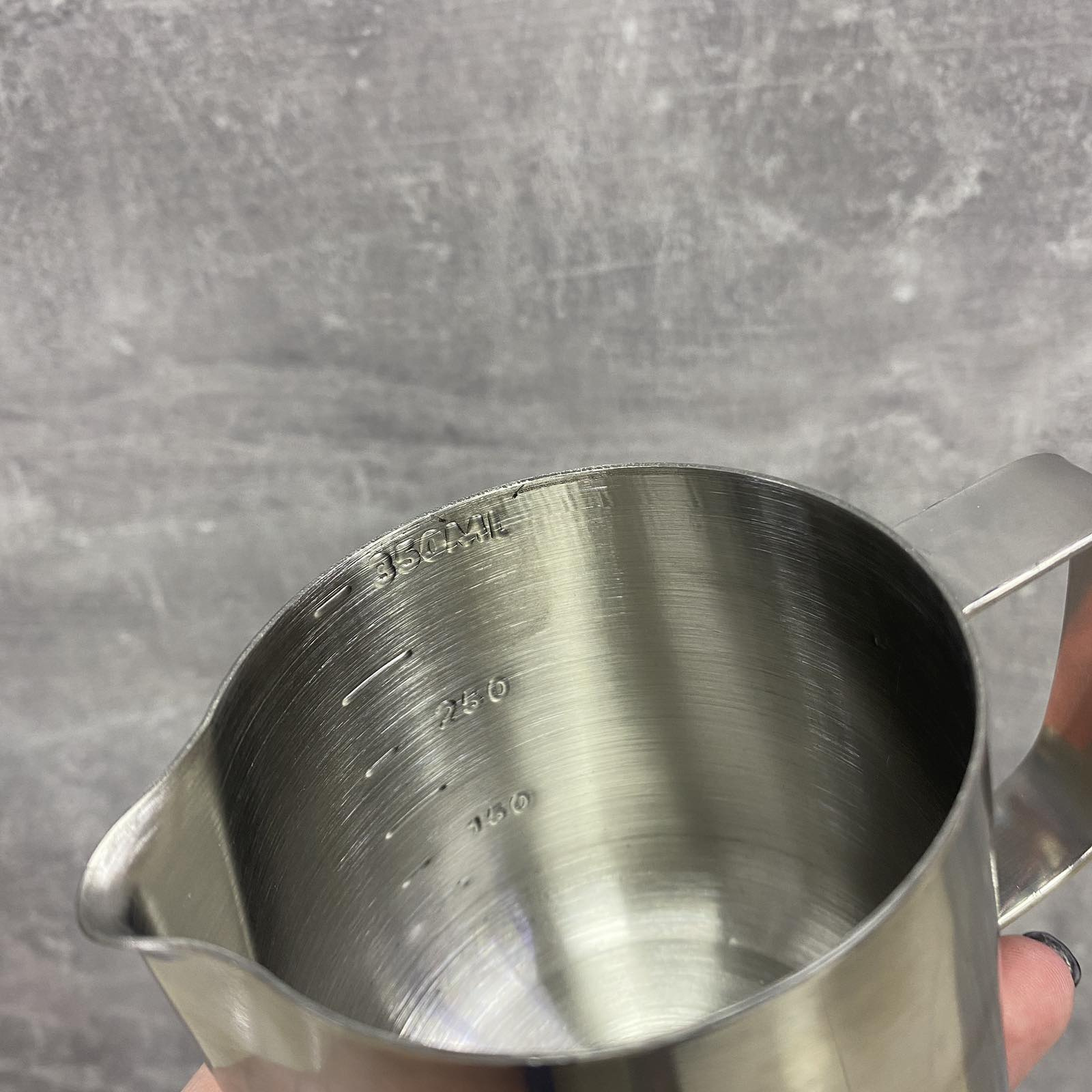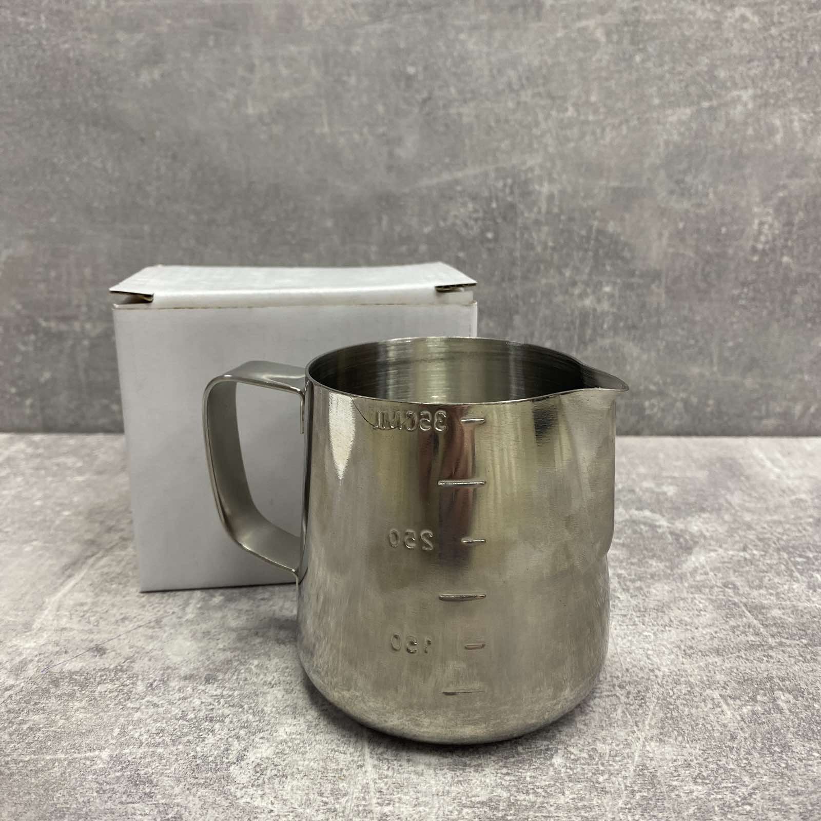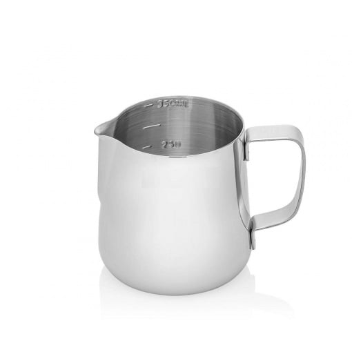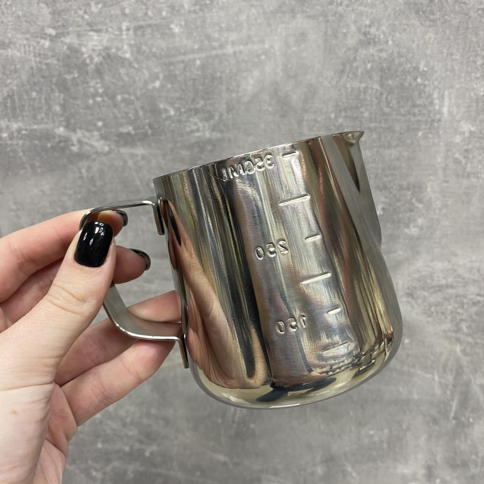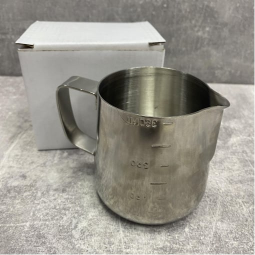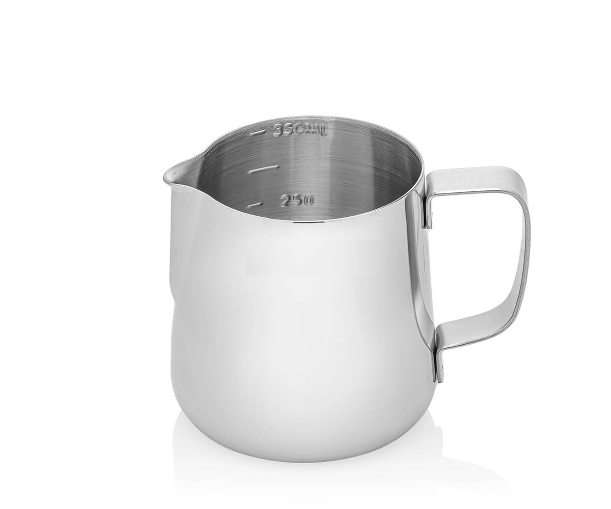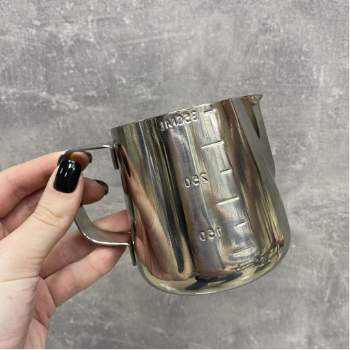 Зроблено цей пітчер із полірованої нержавіючої сталі. Носик пітчера зроблений спеціально для зручного наливання молока в чашку, що добре підходить для латте-арт. Таким пітчером зручно малювати. Тонка струмінь дозволяє отримувати дуже точний малюнок. Пітчер (або молочник) – один із головних інструментів бариста.