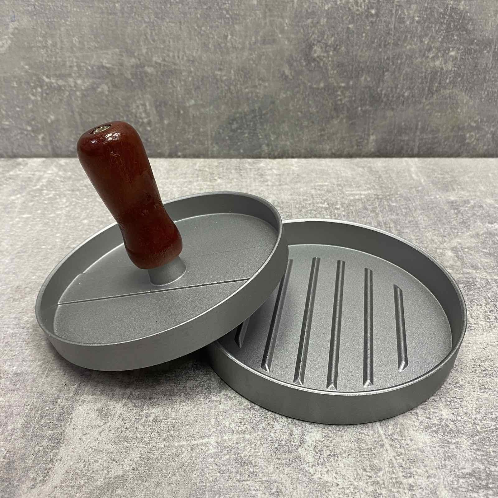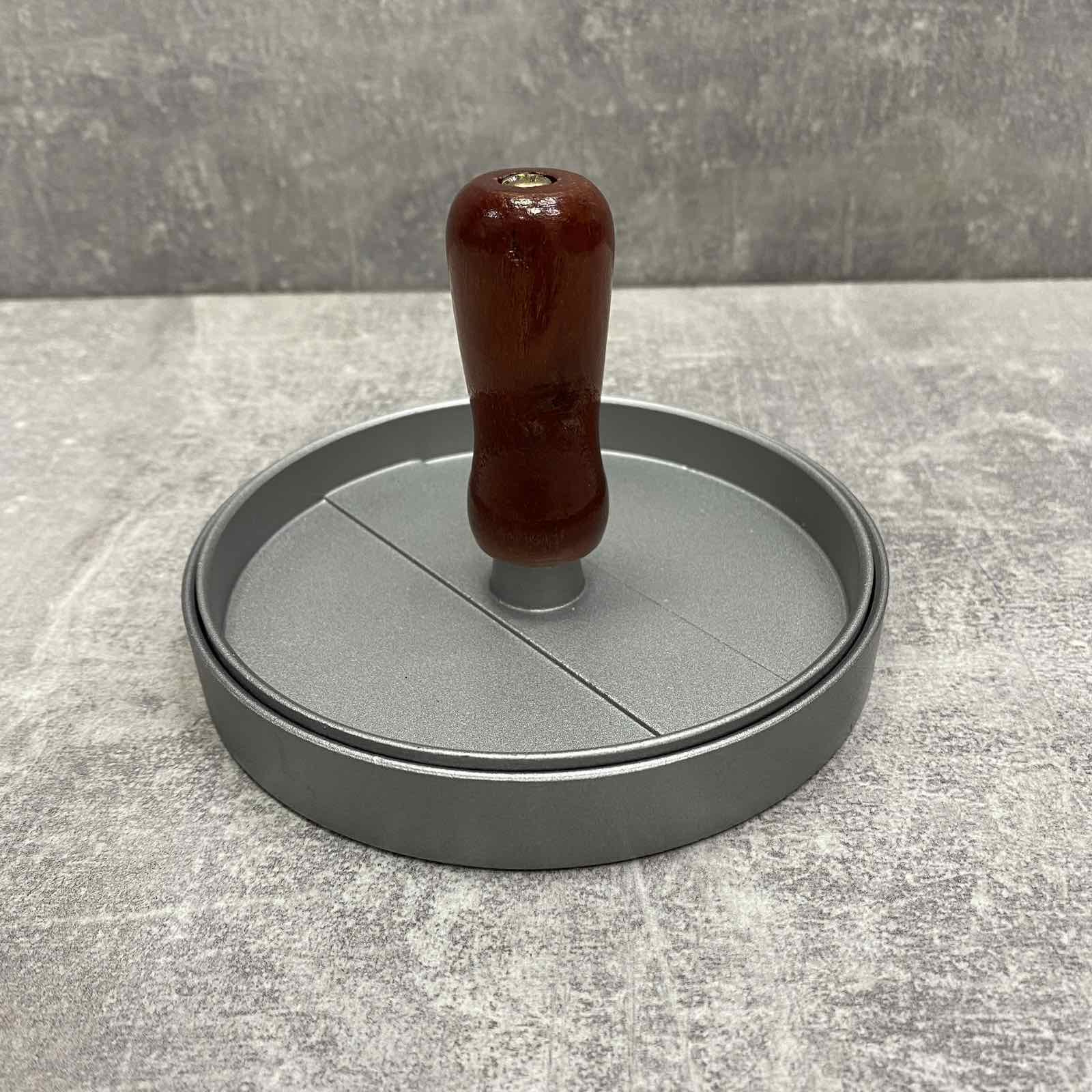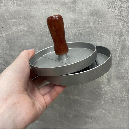 Прес для котлет - простий і швидкий спосіб сформувати котлету, що ідеально підходить до гамбургера. Прес виготовлений із алюмінію. Зручна ручка виготовлена із дерева. Використовувати цю форму легко, достатньо покласти підготовлений фарш на нижню частину форми, закрити верхньою частиною та притиснути. Ви матимете ідеальну котлету класичного вигляду. Для зручності вилучення котлети з преса можна використовувати пергаментний папір. Для створення котлети ідеально круглої форми достатньо заповнити форму м'ясним, рибним чи овочевим фаршем та придавити ручку преса. Догляд: Будь-які миючі засоби для посуду. Не мийте абразивними засобами, які можуть подряпати. Не допускайте контакту з відкритим вогнем.