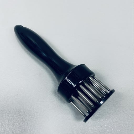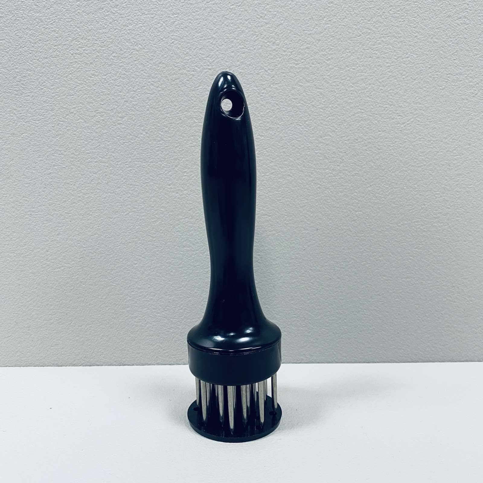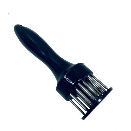 Розм'якшувач для м'яса з голками 19*5 см см Тендерайзер Empire EM-9918 чорний При обробці тендерайзером волокна продукту травмуються менше, ніж при обробці сапкою або молотком, а сполучні тканини, навпаки, максимально руйнуються. Крім того, теплові хвилі легше проходять крізь тканини розпушеного продукту, і м'ясо просмажується набагато швидше та рівномірніше. Головним призначенням тендерайзера це надання м'ясу пухкої консистенції, що дозволяє прискорити процес приготування продукту і значно економить час роботи кухаря. Характеристики: Вид: Розм'якшувач Призначення: Для м'яса Матеріал корпусу: Пластик Матеріал леза: Нержавіюча сталь Колір: Чорний Кількість лез: 24 шт Довжина: 19 см Діаметр: 5 см