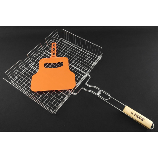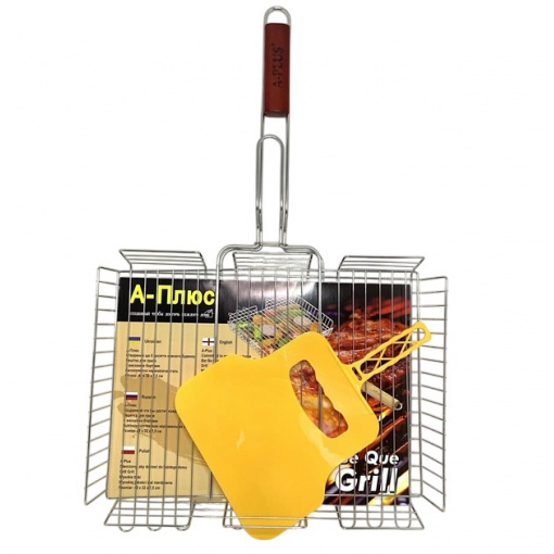 Грати-гриль з бортами. Відрізняється зручним лотком із решіткою для регулювання по висоті та високими бортами. Допоможе вам швидко та просто приготувати смачну страву під час відпочинку на природі чи на дачі. Готування на решітці не вимагає особливих навичок чи умінь - просто закладаєте у неї продукти, закриваєте ґрати та ставите на вугіллі. На решітці можна швидко приготувати м'ясо, рибу, овочі, підсмажити сосиски або ковбаски, втім, все, що душа забажає. Грати для гриля 40 х 32 х 7,5 см A-PLUS 1882 Характеристики: Розмір: 40 х 32 х 7,5 см; У наборі віяло із пластику; Матеріал: нержавіюча сталь, дерев'яна ручка .Тип: Гриль-сітка