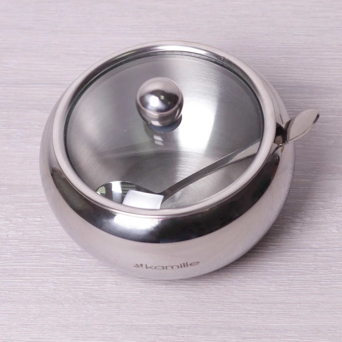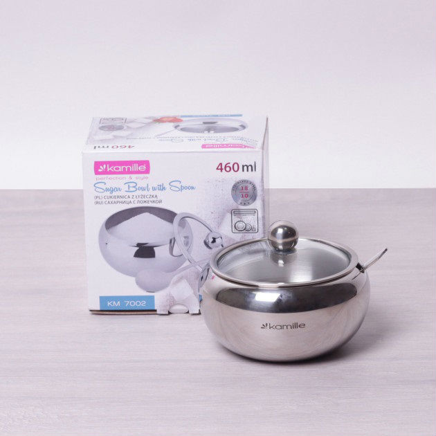Цукорниця Kamille 460 мл з нержавіючої сталі з ложечкою та скляною кришкою КМ-7002