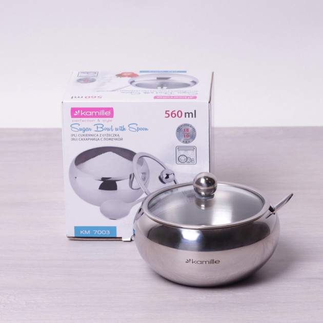 Цукорниця Kamille — незамінний аксесуар для зберігання цукру та його подачі на стіл під час чаювання. Цукорниця виконана із високоякісної нержавіючої сталі із застосуванням сучасних технологій виробництва. Цукорниця Kamille відрізняється своєю практичністю та зручністю, а також привабливим та естетичним зовнішнім виглядом, завдяки чому вона неодмінно підійде до дизайну Вашої кухні.