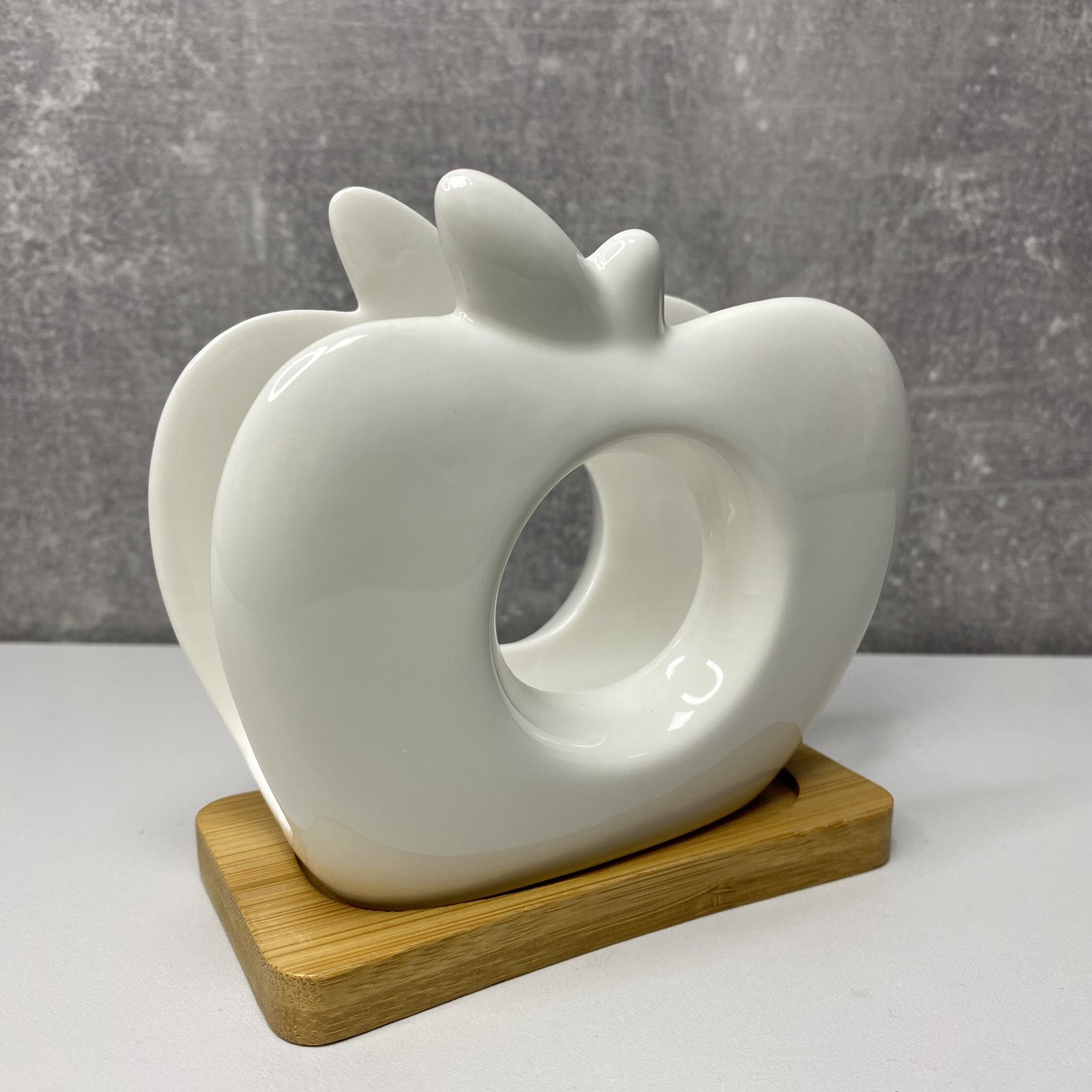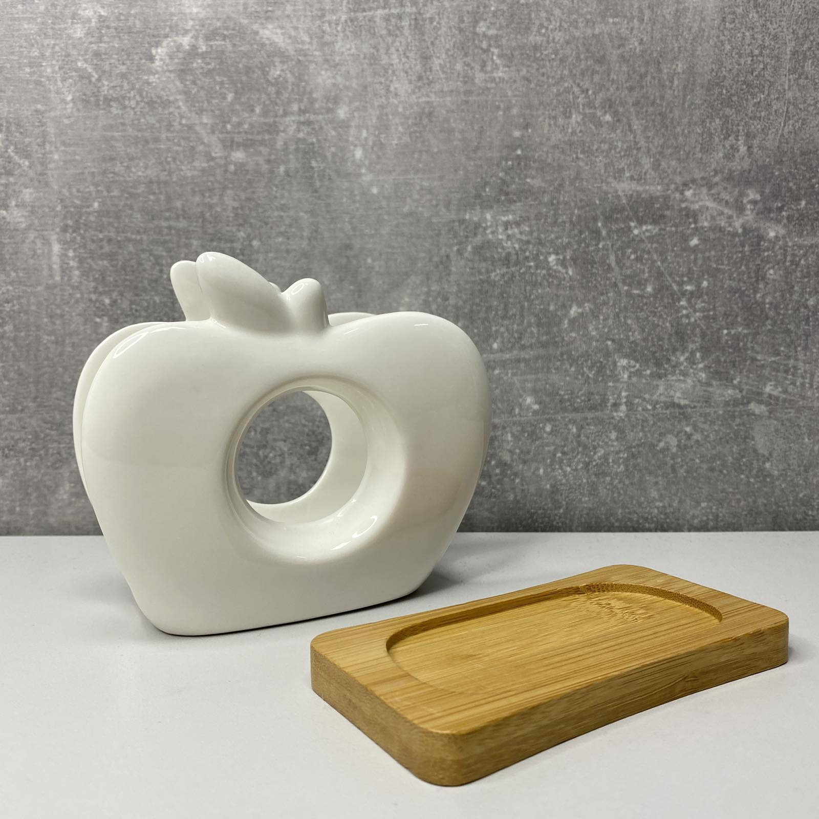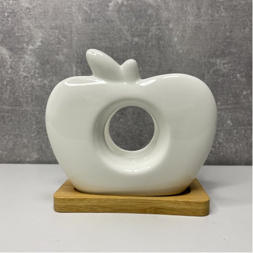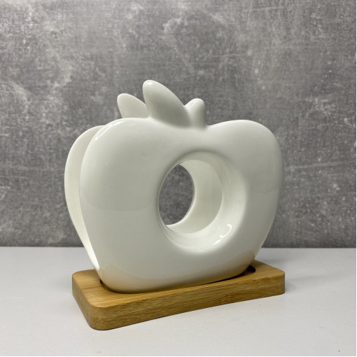 Оригінальна форма у вигляді білого яблука. Біла порцеляна з дерев'яною підставкою з натурального вологостійкого бамбука.