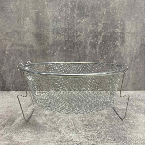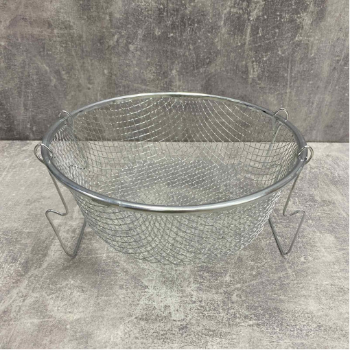 Виготовлена з нержавіючої сталі у вигляді сітки, що забезпечує безпечне та довговічне використання у фритюрницях, скороварках. Підходить для швидкого приготування в розпеченій олії м'ясних, овочевих, рибних закусок, і дозволяє практично відразу позбавитися надлишків жиру. За допомогою двох ручок, що складаються, і невеликої ваги, кошик можна безпечно переміщати. Посуд легко миється у теплій воді за допомогою м'якої губки.