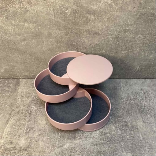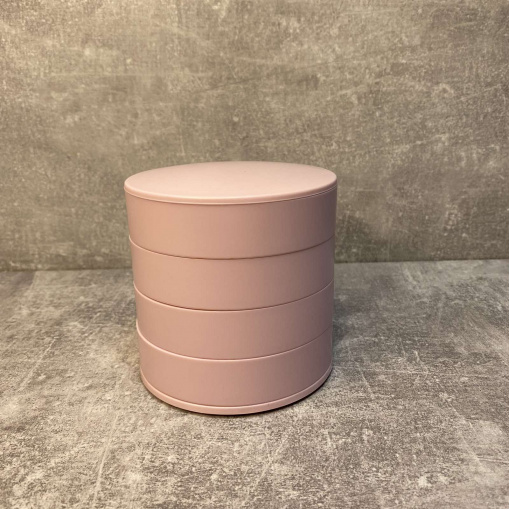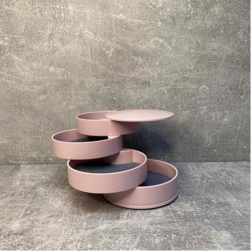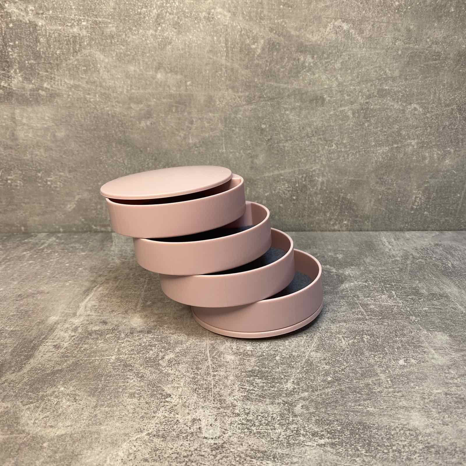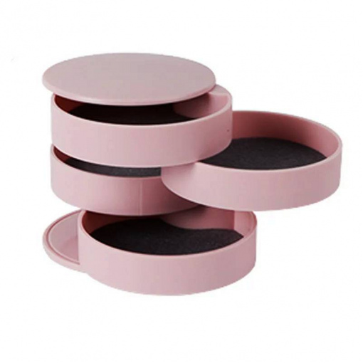 У цій диво скриньці містяться всі необхідні ювелірні прикраси та аксесуари. Усі яруси, зокрема і дзеркало, обертаються на 360°. Дзеркало обертається у будь-який бік, нахил тримає. Якість обов'язково потішить. У кожному ярусі вкладено повстяну прокладку від ковзання прикрас. На денці є 4 прогумовані ніжки (вкладиші).