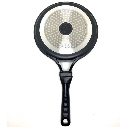 Сковорода для млинців (гранітне покриття) Сковорода виготовлена ​​з високоякісного литого алюмінію, що характеризується високою теплопровідністю та має гранітне покриття – екологічно придатне для термічної обробки їжі. Поверхні цього товару містять шкідливі речовини. Гранітне покриття рівномірно розподіляє тепло по поверхні, що заощаджує витрати енергії на приготування млинців, омлетів та значно зменшує витрати жирів при жарінні. Пристосована для виготовлення на всіх сучасних типах плит. За допомогою зручної ручки бакелітової сковороду легко і безпечно переміщати в процесі використання. Ручка не нагрівається та не деформується. Сковорода легко миється у теплій воді та має невелику вагу.