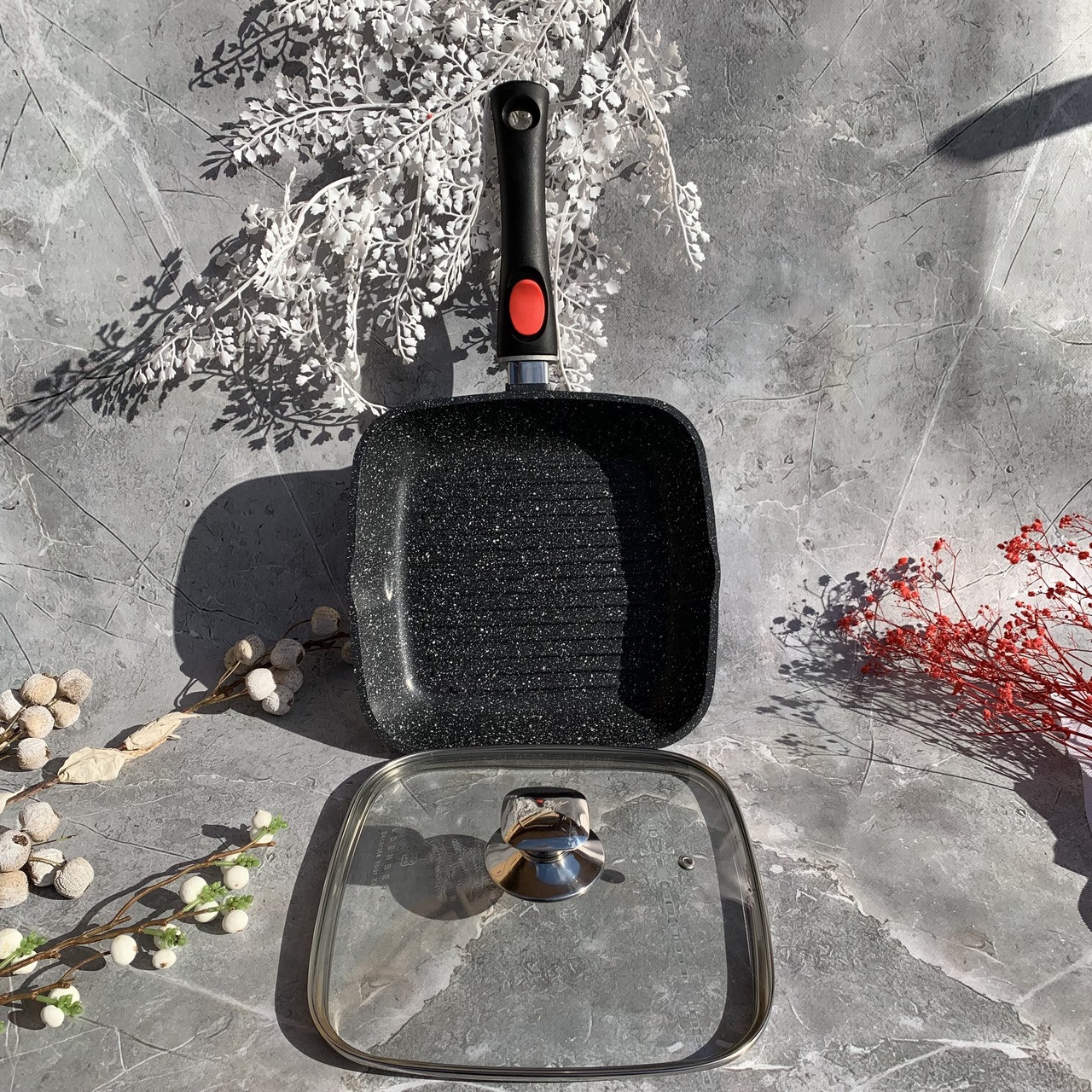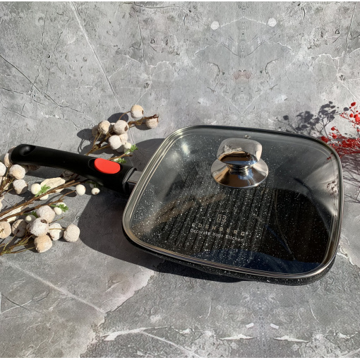 Сковорода-гриль із знімною ручкою 24 см з антипригарним мармуровим покриттям Edenberg-8129 Сковорода-гриль із кришкою алюмінієва сковорода із двостороннім тришаровим мармуровим покриттям із мармурової крихти. Знімна ручка дозволяє зручно зберігати сковороду в холодильнику, використовувати сковороду в духовці, зливний носик для олії. Характеристика: Вид: Сковорода-гриль Матеріал: Алюміній Матеріал ручки: Бакеліт Діаметр: 24 см Форма: Квадратна Матеріал кришки: Скло Антипригарне покриття: Мармурова Сумісність із джерелами тепла: Всі види плит
