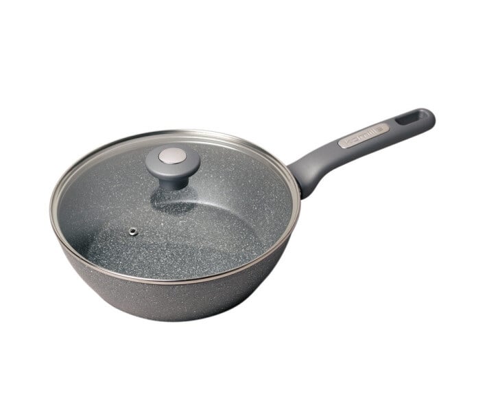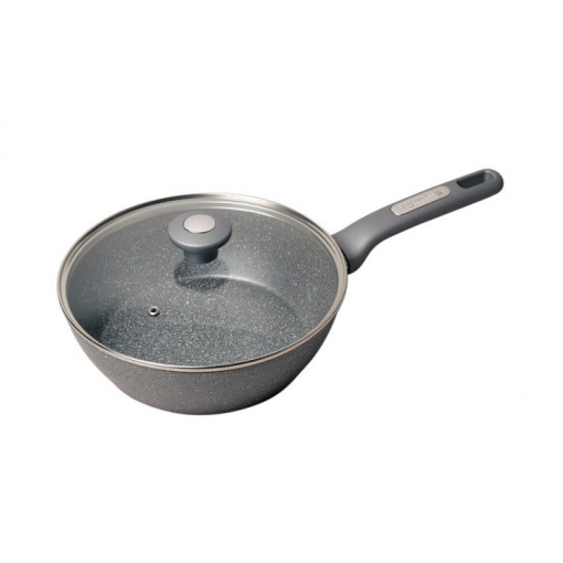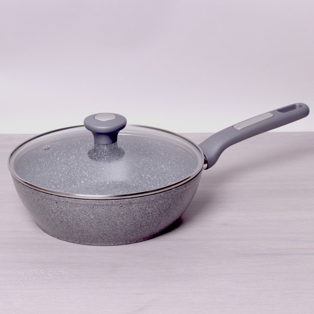 Виконана сковорода з литого (кованого) високоякісного алюмінію. Багатошарове антипригарне покриття з гранітним нанокомпозитом дозволяє легко приготувати страви різного ступеня прожарювання. Глибина дозволяє використовувати сковороду як сотейник. Посилене, багатошарове дно дозволяє сковороді рівномірно нагріватися навіть на невеликій конфорці і використовувати її на всіх типах плит. Ергономічна ручка з бакеліту дозволяє тримати її без прихваток. Кришка з жароміцного скла, є отвір з паровідведенням та обід з нержавіючої сталі, що оберігає кришку від сколів. Сковорода чудово миється як вручну, способом теплого замочування, так і за допомогою посудомийної машини.