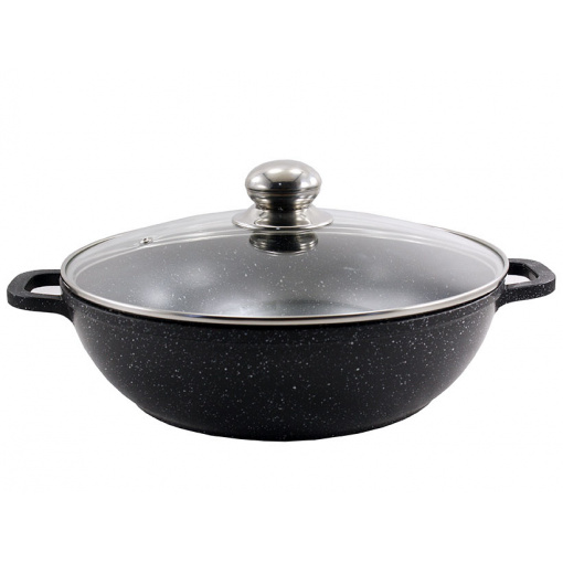 Характеристика: Вид: Сотейник-Жаровня Матеріал: Алюміній Антипригарне покриття: Мармурове Об'єм: 4,1 л Матеріал кришки: Скло Колір: Чорний Форма: Кругла
