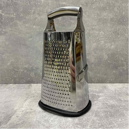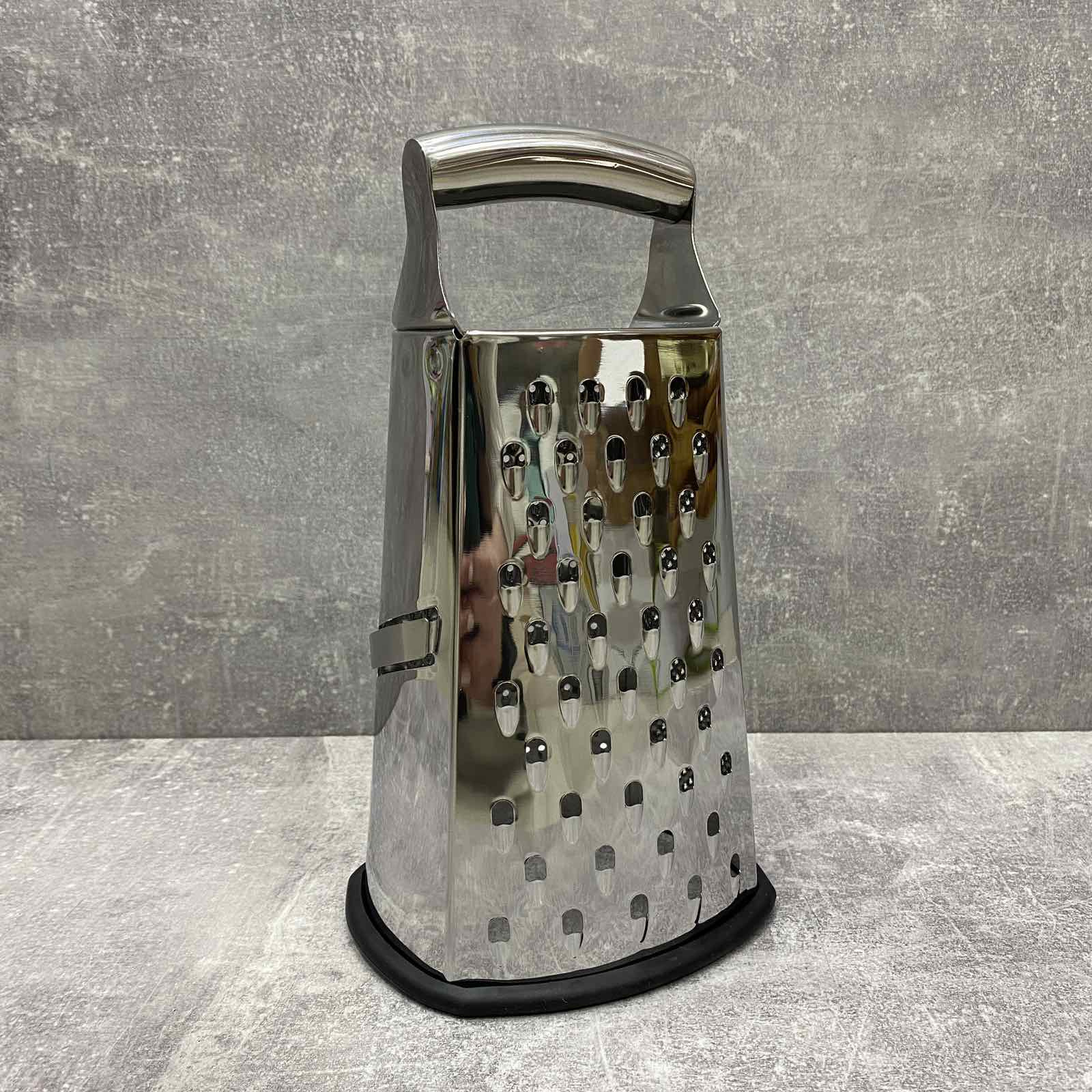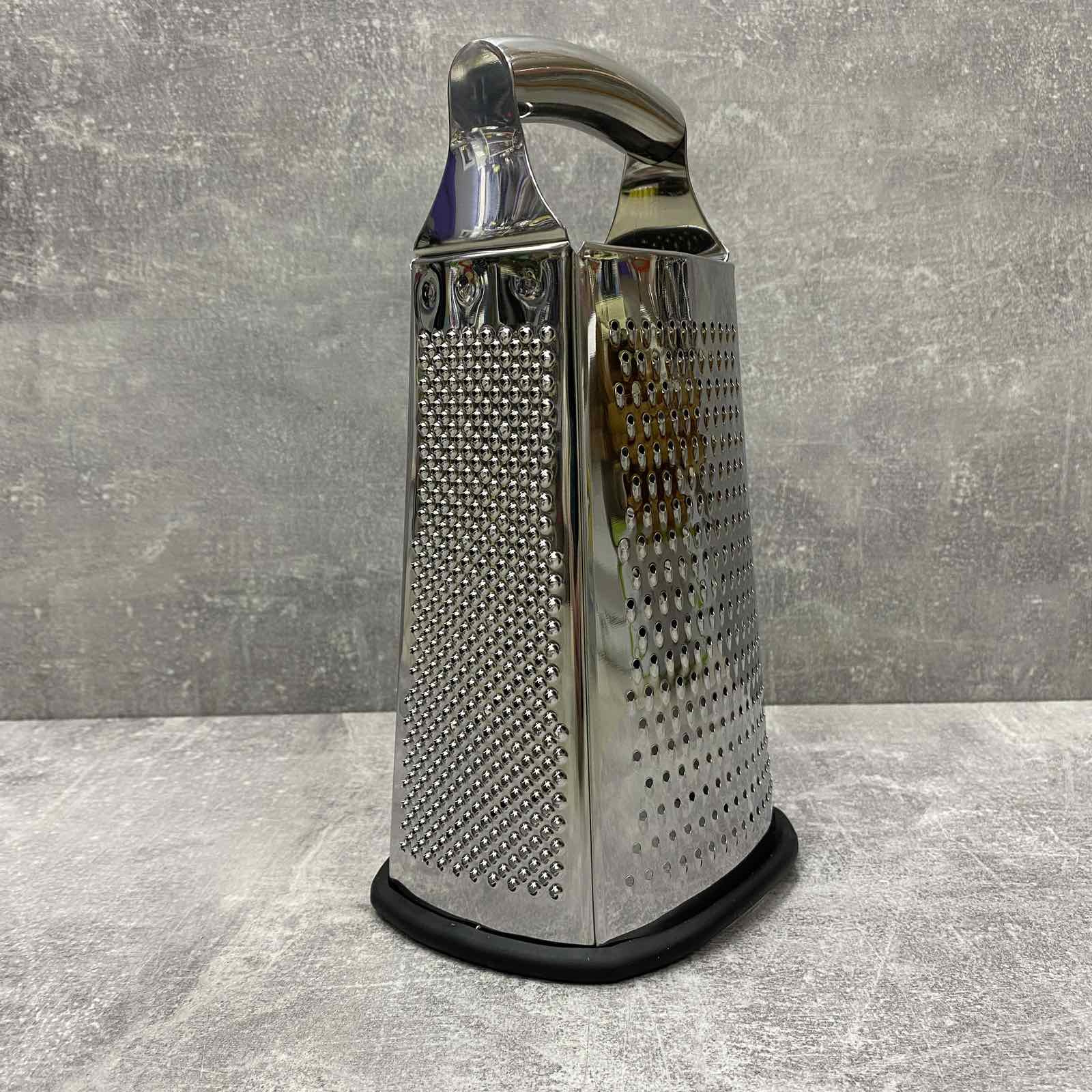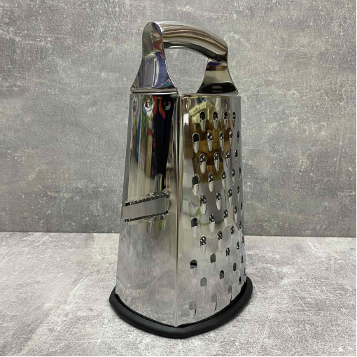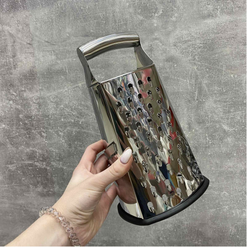 Тертка виготовлена з нержавіючої сталі високої якості та ручка із міцного пластику. Цей метал не входить у реакцію з їжею під час експлуатації, отже не змінює її смак і запах. Товар є міцним та довговічним. Легко очищається навіть у холодній воді, рекомендується миття вручну. Має сучасний яскравий дизайн. Така велика терка для овочів оснащена зручною ручкою із міцного пластику. Стане багатофункціональним помічником, завдяки наявності 4 сторін з різними за формою та розміром лезам для кожної господині та на будь-якій кухні їдальні, кафе чи ресторану. Заощадить місце на кухні. Терка для продуктів чудово підходить для обладнання громадського харчування.