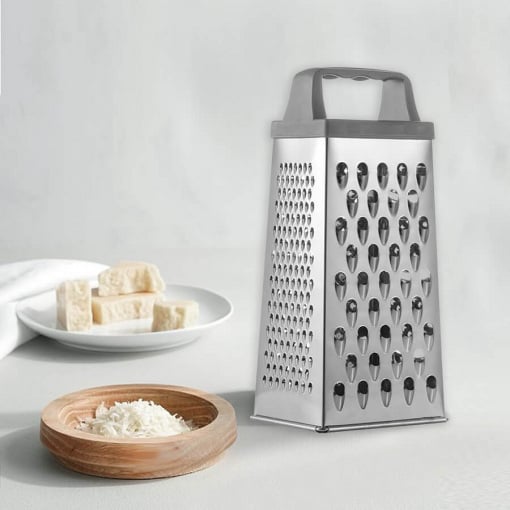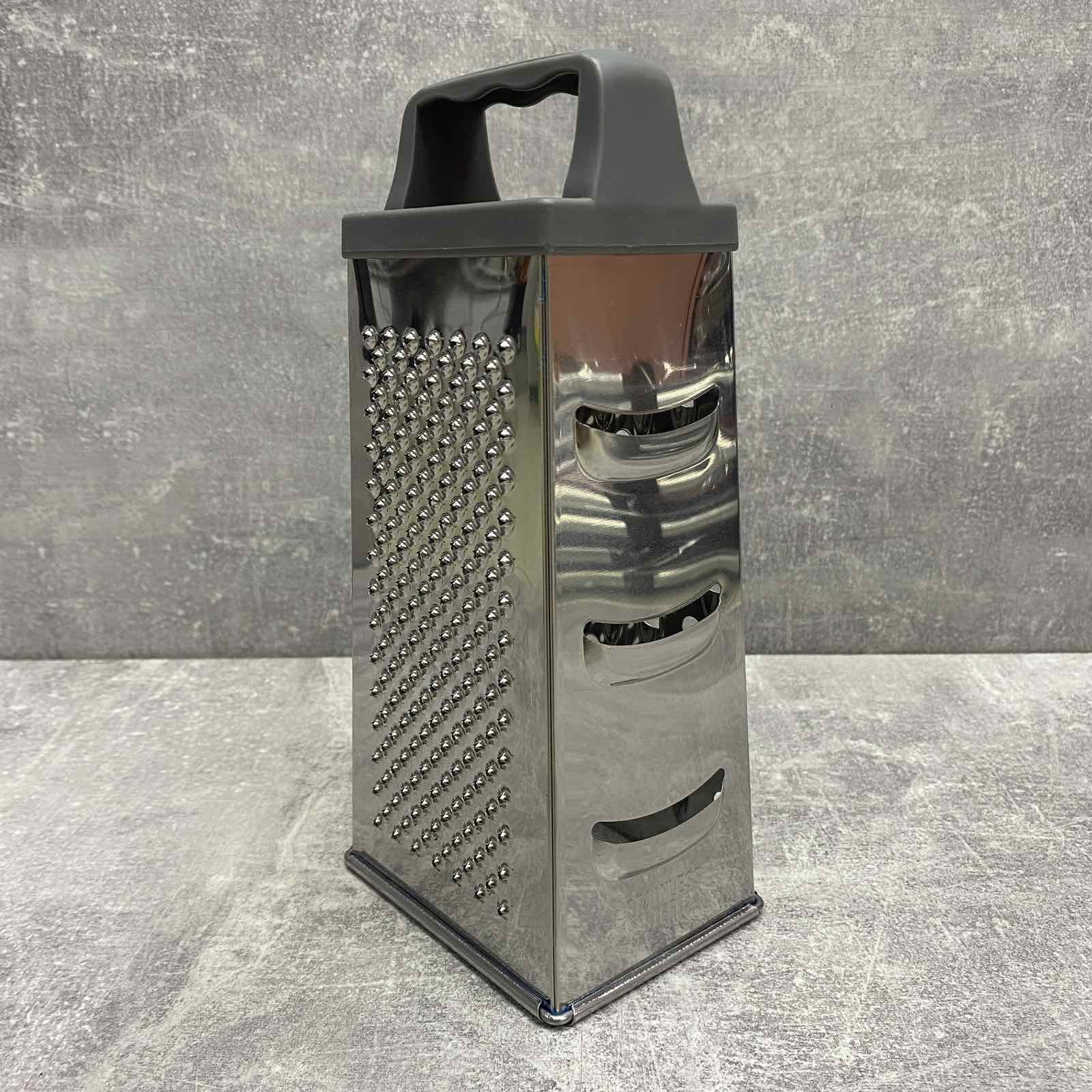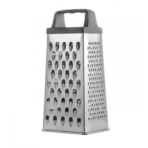 Тертка виготовлена із нержавіючої сталі високої якості. Цей метал не входить у реакцію з їжею під час експлуатації, а отже, не змінює її смак та запах. Легко очищається навіть у холодній воді. Має сучасний дизайн із яскравими елементами. Така терка для овочів оснащена зручною ручкою із міцного пластику. За допомогою такої кухонної терки легко натерти і нашаткувати будь-який продукт.