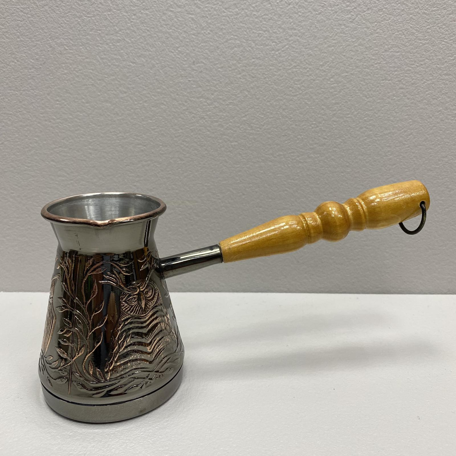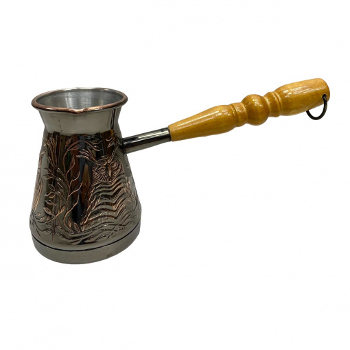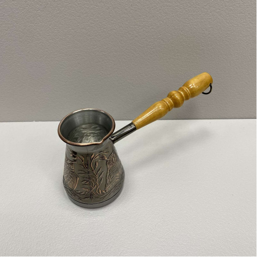 Виготовлена ​​з листової міді. Мідь – найкращий матеріал для рівномірного та правильного прогрівання кави. Зовнішні стіни вкриті жароміцним сріблястим тоном і мають натуральний блиск. Мідну турку можна використовувати на газовій, електричній та склокерамічній плиті. Дерев'яна ручка з підвісним кільцем красива та зручна у використанні.