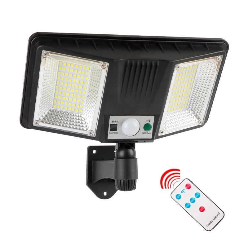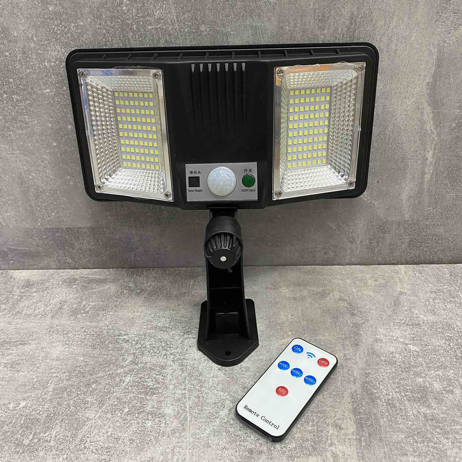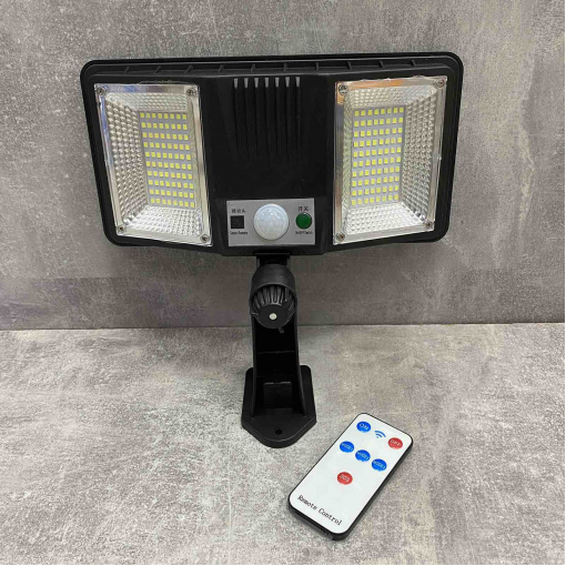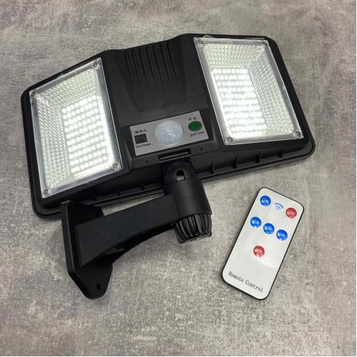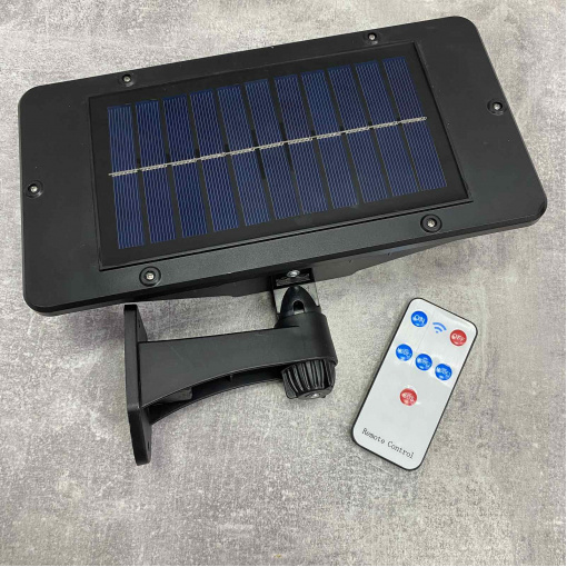 Високопотужний, водонепроникний, настінний світильник, PIR сенсор, на сонячній батареї та пультом дистанційного керування. Батарея розташована на обороті лампи, що заощаджує місце та час розміщення. Включається протягом 30 секунд після потрапляння об'єкта в поле датчика руху, автоматичне вимкнення через 5 хв після виходу із зони. Радіус дії 5м. Лампа кріпиться на ніжці із шарнірним механізмом, кут обертання 360 градусів. Дистанційний пульт управління дозволить самостійно керувати включенням та вимкненням ліхтаря.